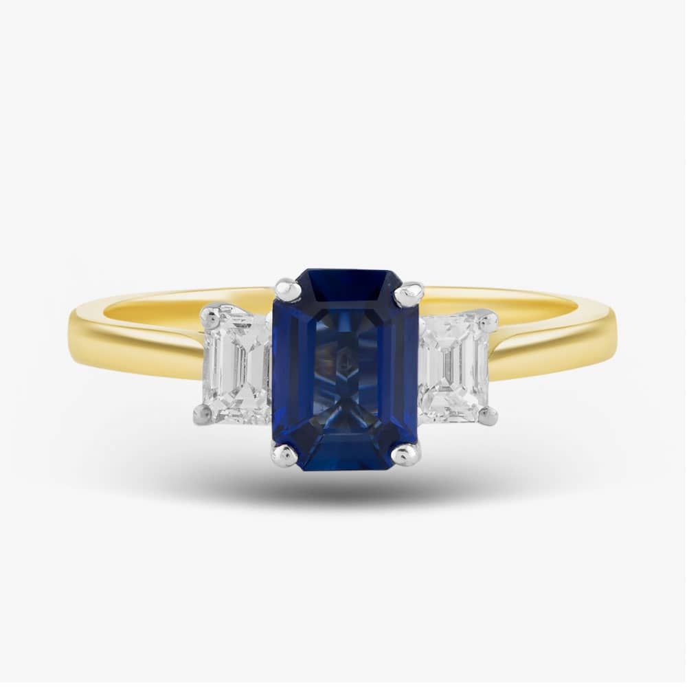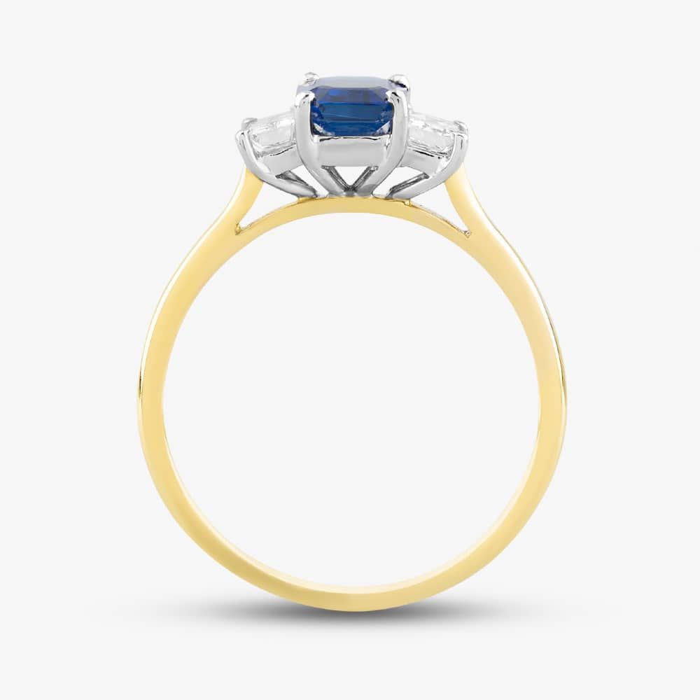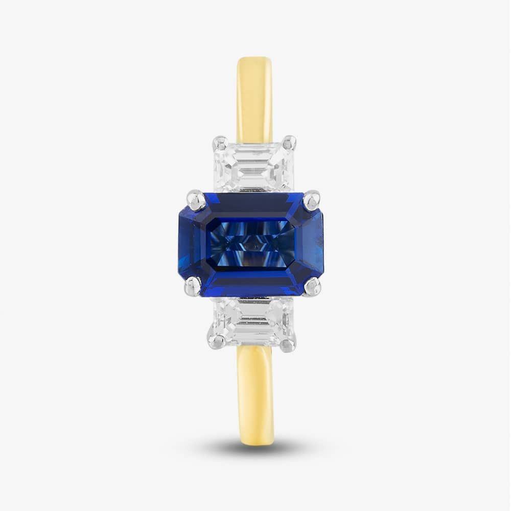 Crafted with a touch of simplicity, this three-stone ring exudes timeless elegance. The delicate 18ct yellow gold is adorned with an emerald-cut sapphire accentuated with a single emerald-cut white diamond set on each side, enhancing the centre stone. Each stone is set in a classic four-claw setting, and promises to sparkle with every movement, making this ring a timeless symbol of subtle luxury.