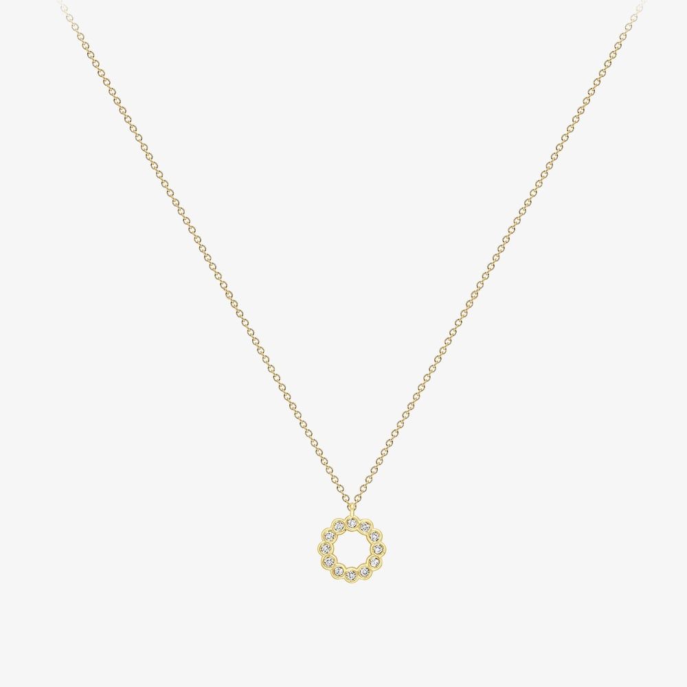 Crafted in luxurious 18ct yellow gold, this elegant necklace features a contemporary open circle pendant adorned with multiple sparkling diamonds. A timeless design with modern flair, it adds a touch of refined brilliance to any outfit.