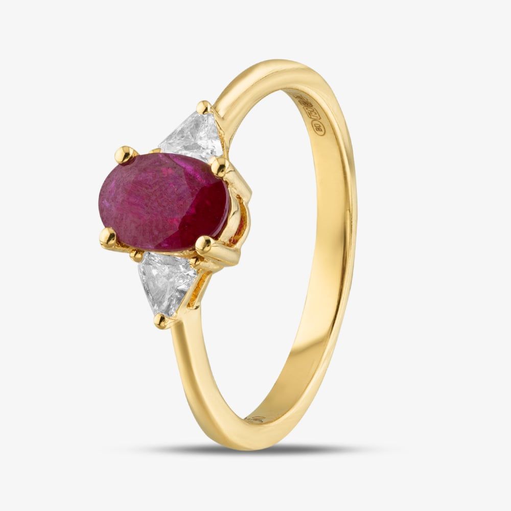This elegant 18ct yellow gold ring features a striking oval-cut ruby at its centre, complemented by a trillion-cut diamond on either side. The design is finished with solitaire diamonds set on the shoulders, creating a sophisticated and timeless piece.