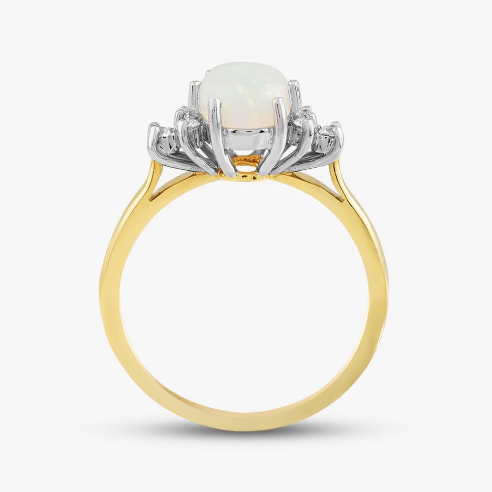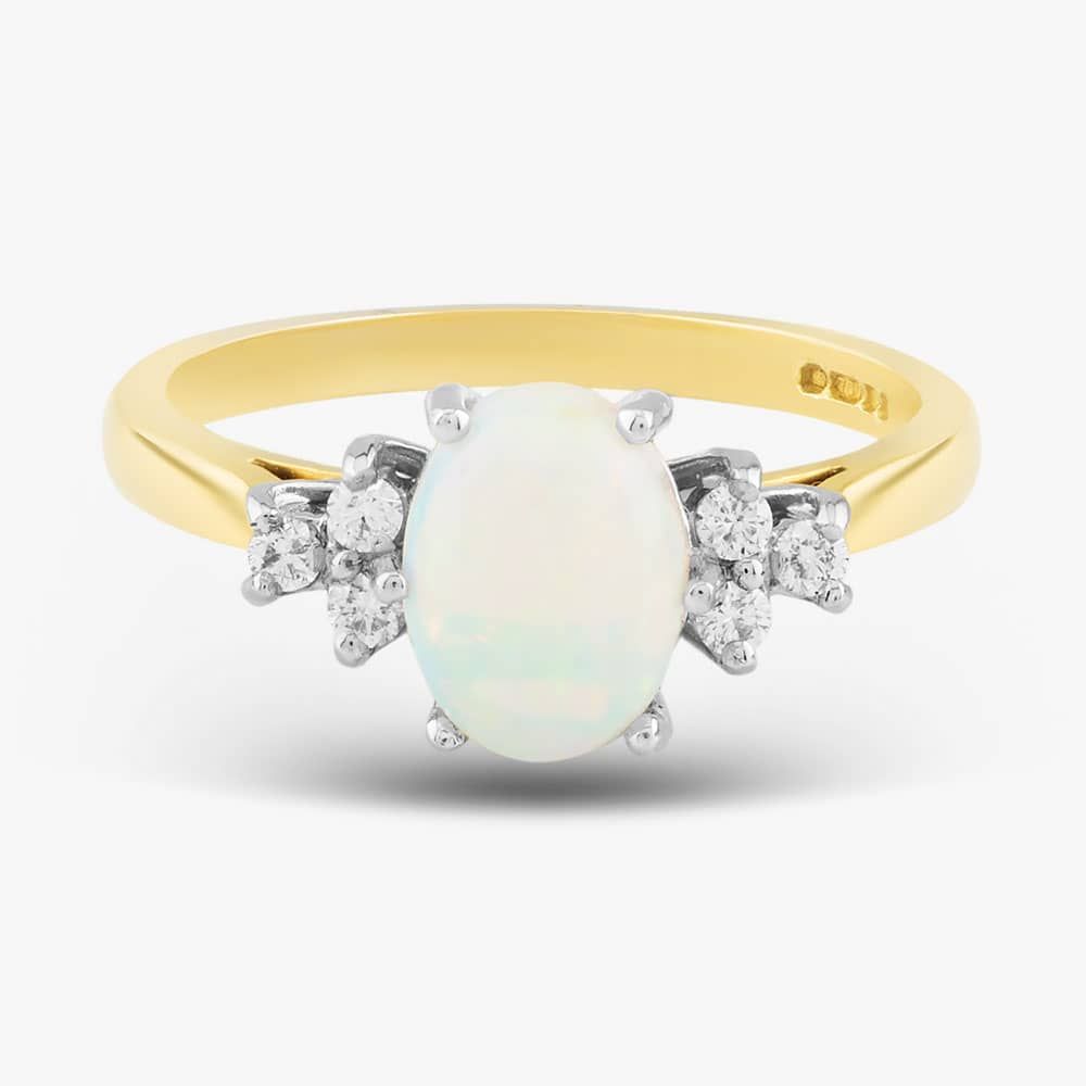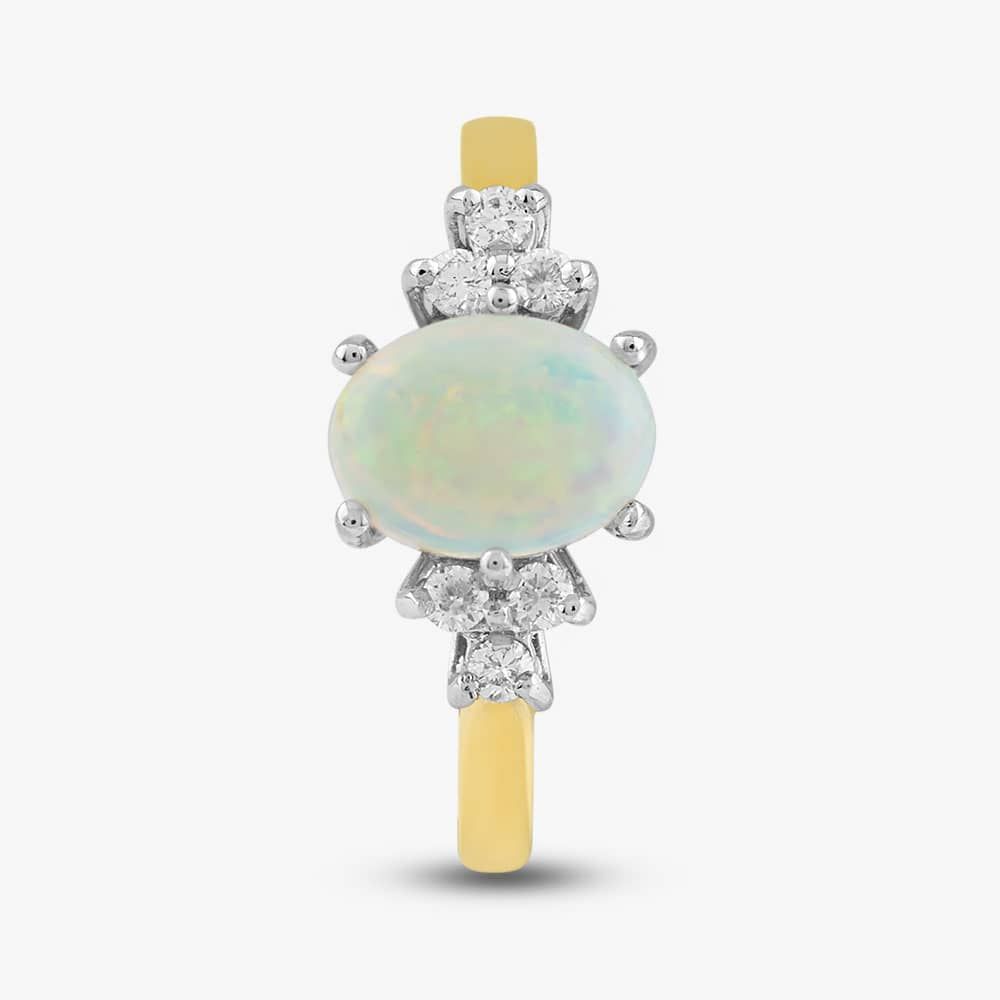 Crafted with a touch of simplicity, this diamond shoulder set ring exudes timeless elegance. Delicate 18ct yellow gold embraces a multi-coloured oval opal centre stone, adorned with three brilliant cut diamonds on each shoulder, which promises to sparkle with every movement, making this ring a timeless symbol of subtle luxury.