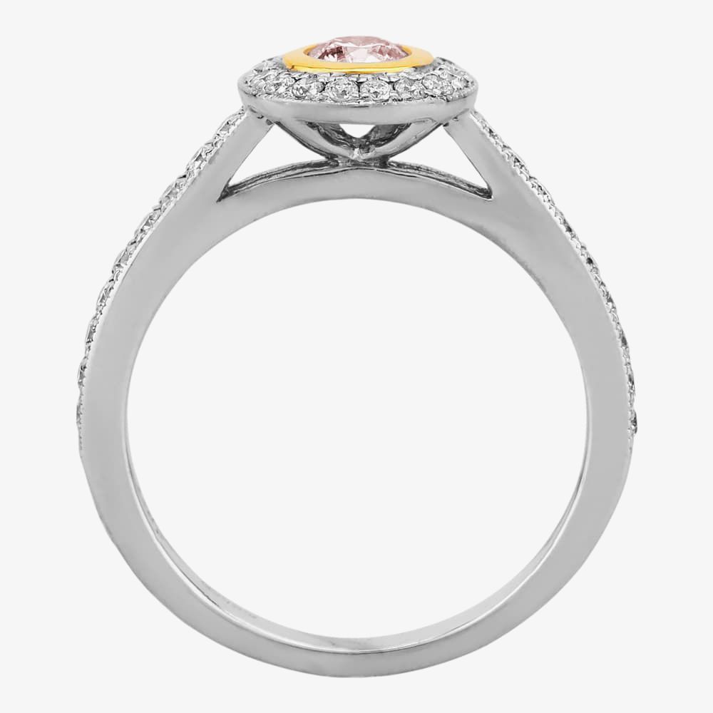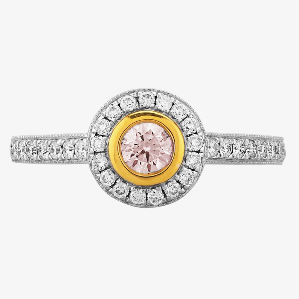 A 0.19ct pink diamond is placed in an 18ct Yellow Gold bezel setting before being given a halo of white diamonds and set on an 18ct White Gold shank with further stones in the shoulders.