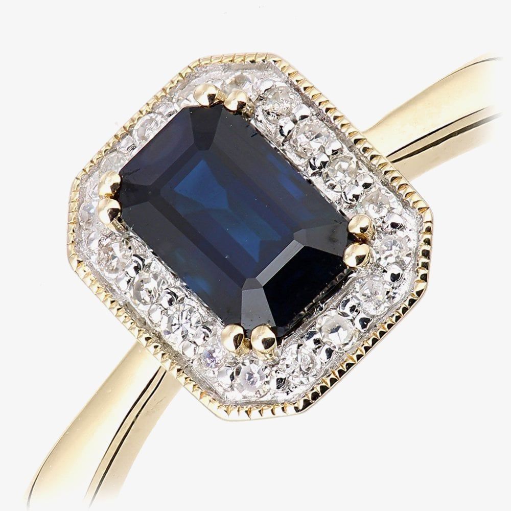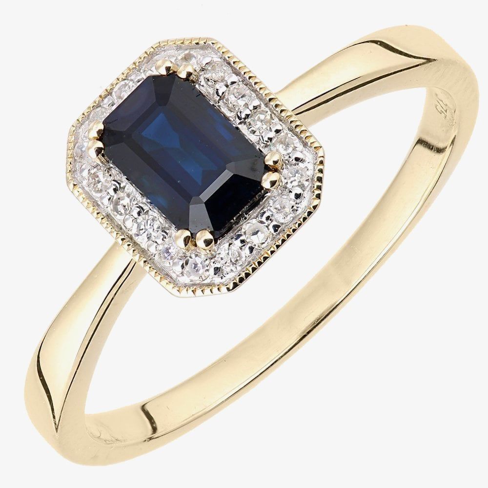 This attractive cluster ring is crafted in 9ct yellow gold & features an emerald cut Sapphire centre stone with a sparkling 0.08ct diamond surround & intricate mill grain edge. This ring is a perfect stand-alone piece or ideal for layering & combining with other rings to create your own unique look.