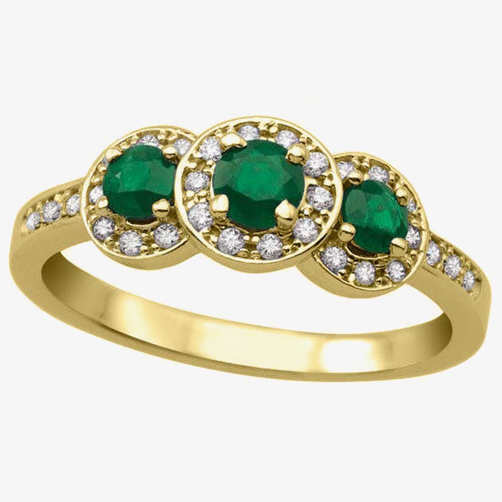Adorn your ring finger with this sophisticated trilogy cluster ring, full of sparkling character you will love to flaunt. Set with thirty diamonds across the shoulders and halos, the triple cluster design is built around a 3.5mm and two 3mm faceted emeralds in a four claw setting. Buy with confidence