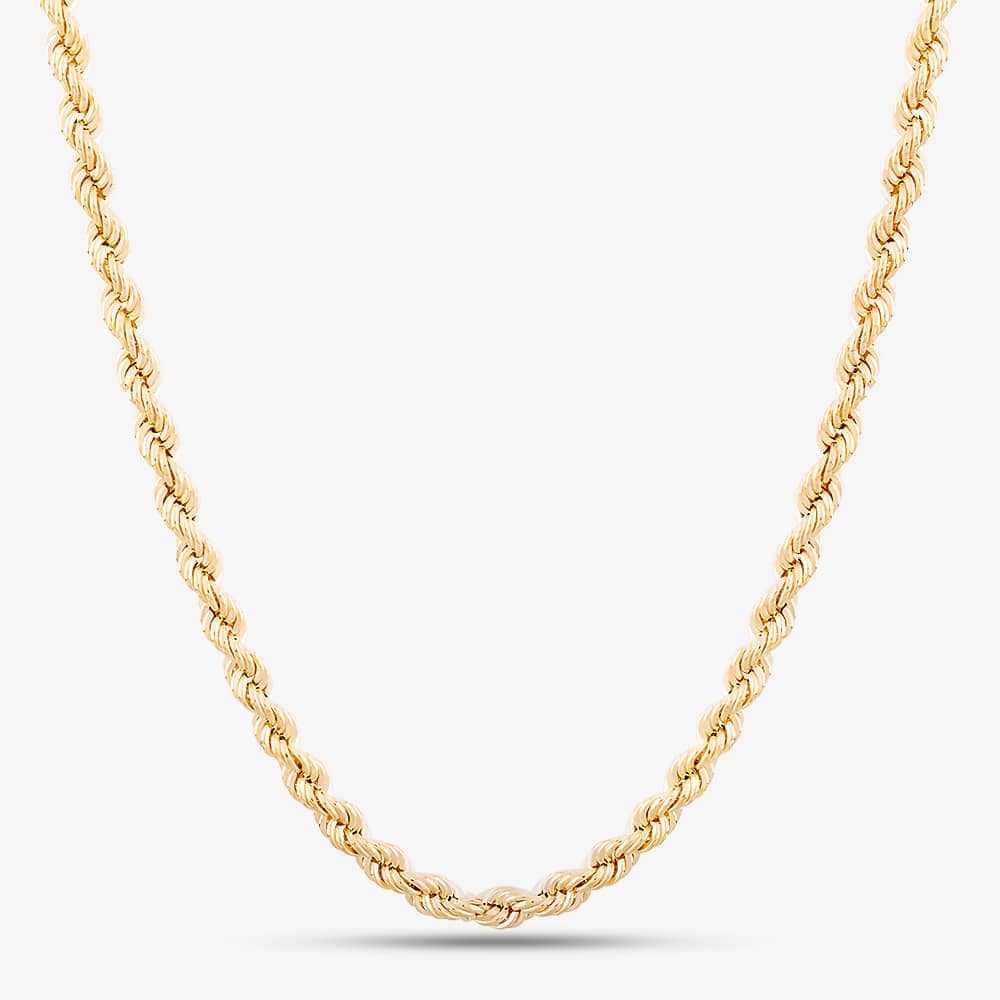 This 18 inch rope chain is created in 9ct Yellow Gold. It has a weight of 2.5g, a depth of 3mm and a width of 5mm.
