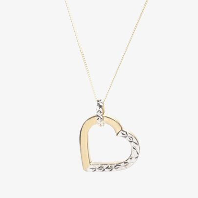 A unique open design is masterfully produced in this 9ct pendant! Two colour gold is wrought attractively with sharp distinctive edges to create a contrasting harmony of colours! The White gold is textured with diamond cut style embossed design complimenting the smooth yellow gold attractively! Product Details: - Open Heart Design - Diamond Set