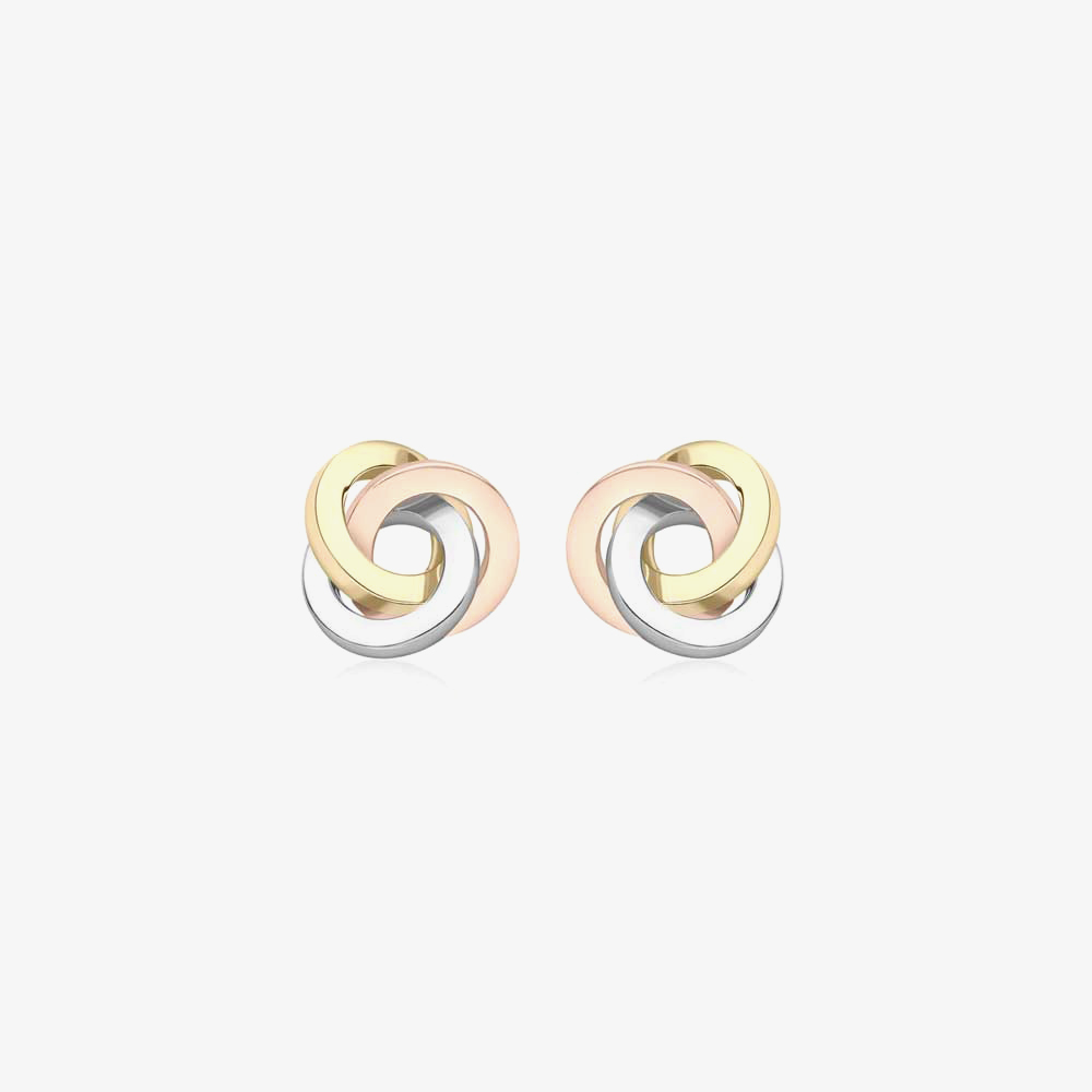 Bring a stylish contemporary edge to your outfits with this stunning pair of stud earrings, suitable for all occasions. Expertly crafted from three colours of 9ct gold, featuring an interlocking knot design and secure butterfly backs, perfect for pairing with a three-colour pendant to complete the look.