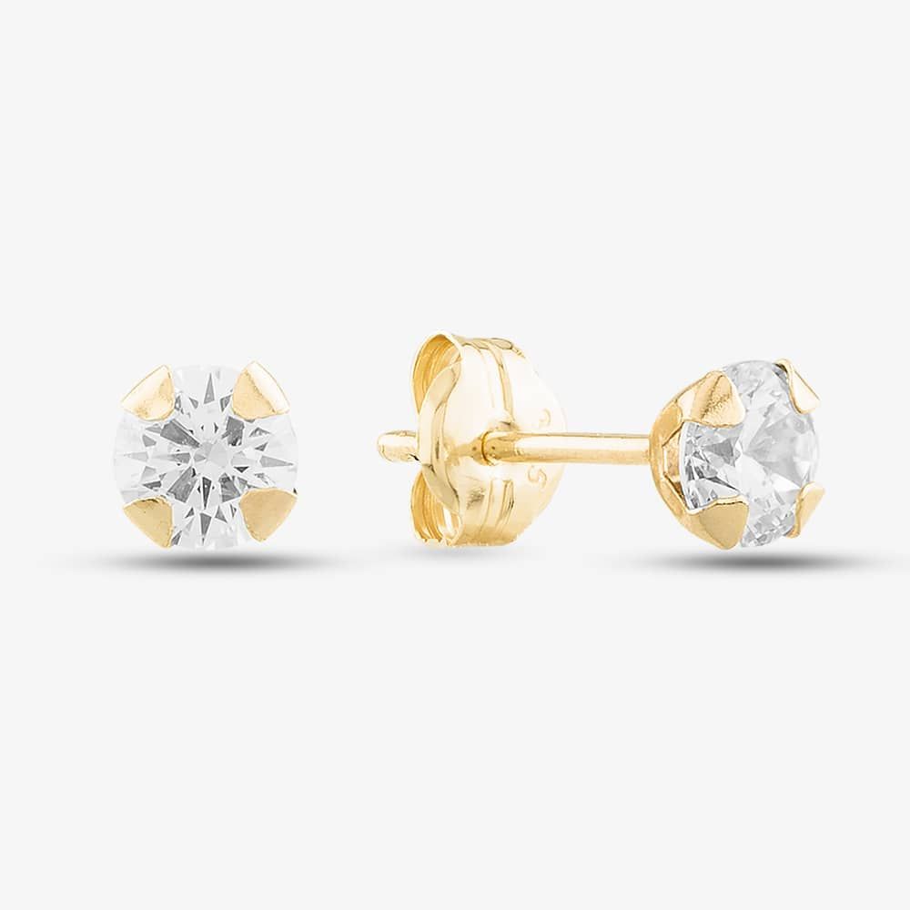 A classic solitaire style setting gives these circular single stud earrings a undeniable appeal. Each 9 carat yellow gold earring features a glittering stone of carefully cut 4mm cubic zirconia giving your night a touch of glamorous sparkle.