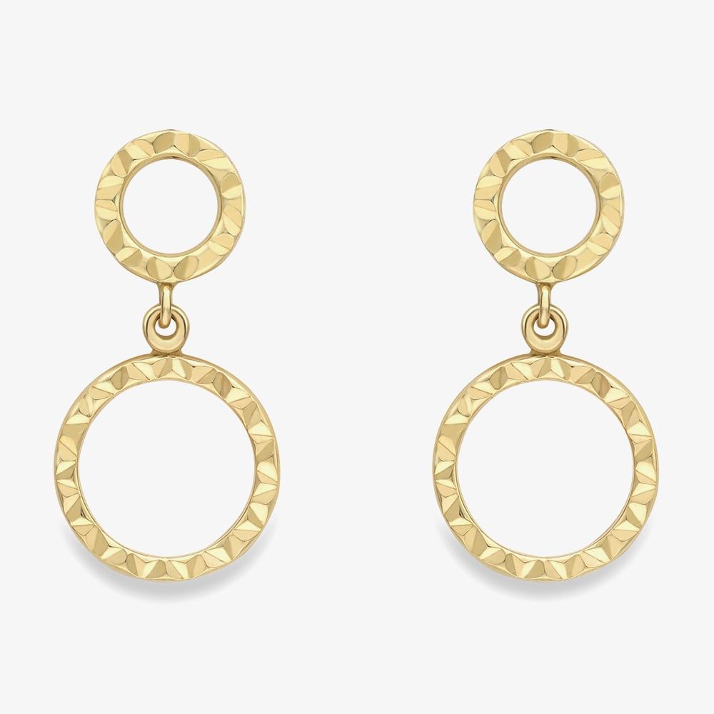 9ct Gold Diamond Cut Double Circle Drop Stud Earrings 120225127471