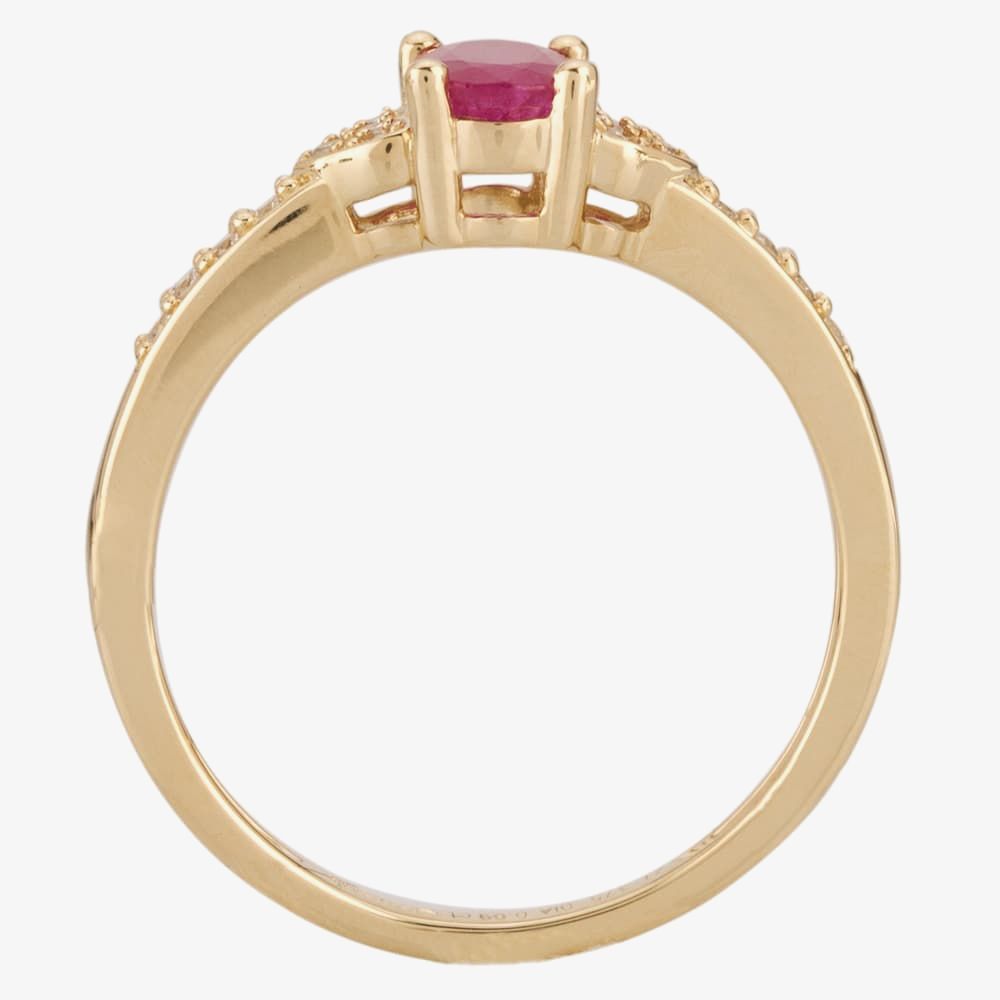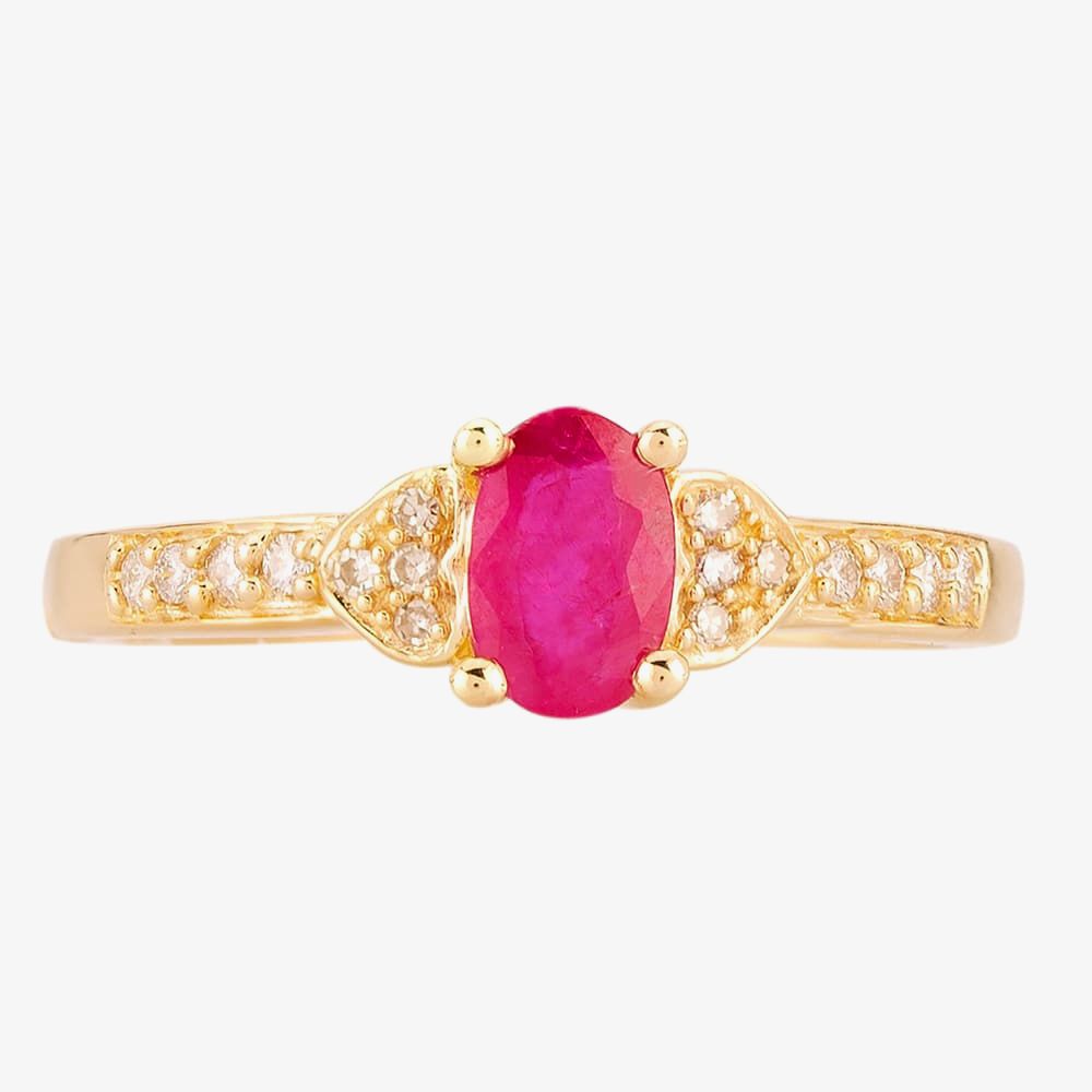 A captivating oval cut claw set ruby is surrounded by diamond set shoulders to create this enchanting 9ct gold ring. The exquisite oval cut ruby boasts red and pink hues which compliment the sparkling white 0.09ct diamonds that adorn the shoulders of the band. This attractive ring is the perfect symbol of your everlasting love.