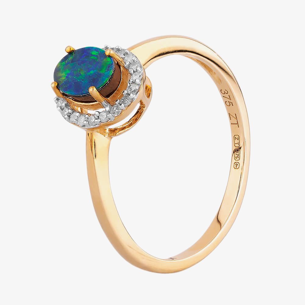 Crafted in 9ct yellow gold, this beautiful ring features an oval shaped blue opal surrounded by a halo of sparkling diamonds. Wear individually or pair with matching items from the collection for the perfect gift for someone special.