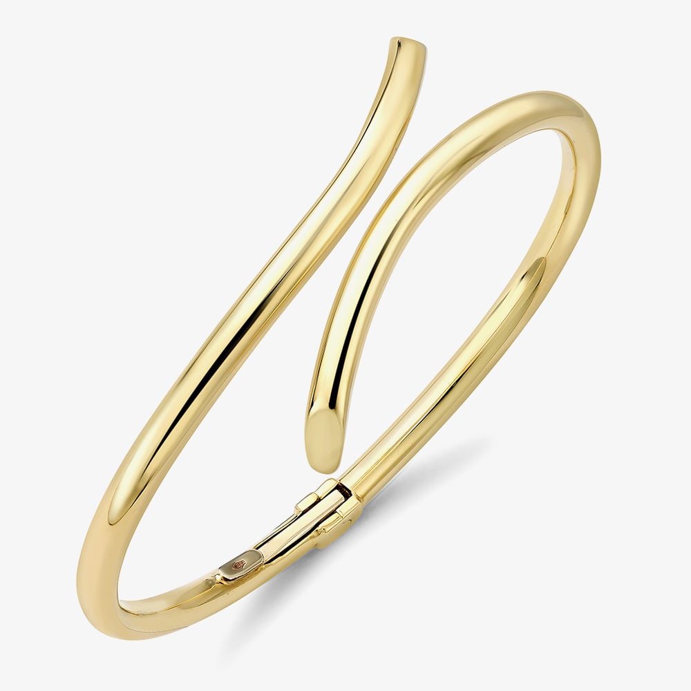This piece is the perfect fusion of style and design, showcasing a crisp crossover form with a subtle curve, all in highly polished 9ct yellow gold. Its stunning, modern aesthetic is complemented by a premium hinge for added functionality. Made in Italy, it offers exceptional craftsmanship and sophistication. With dimensions of approximately 60x52mm and a width of 4mm, this piece stands out as a bold yet elegant statement.