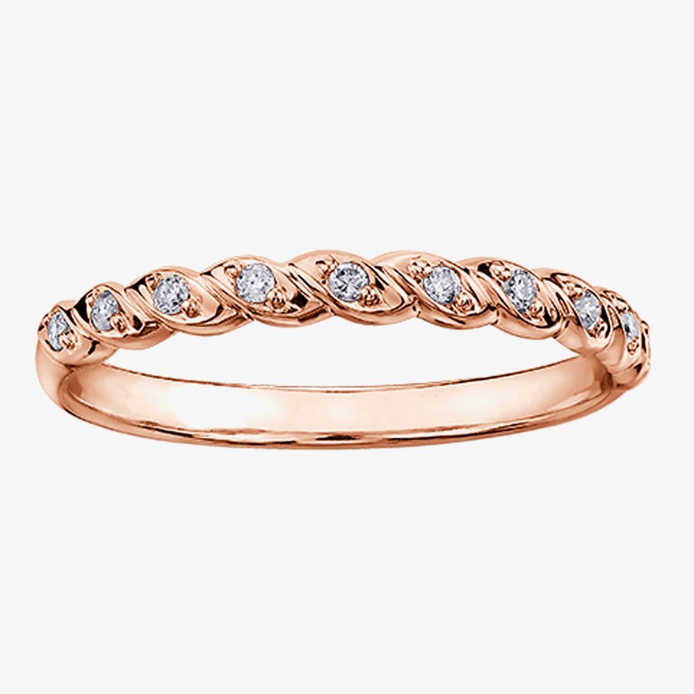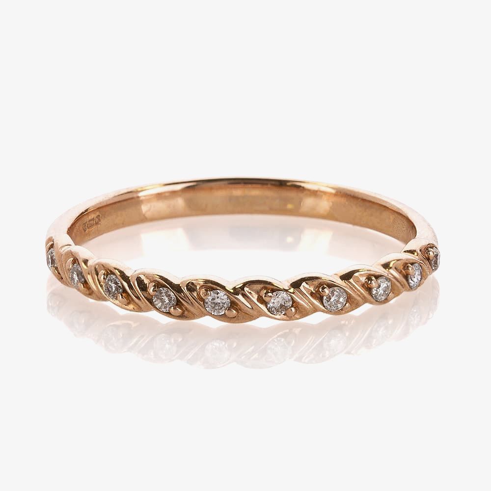 This gorgeous ladies ring is made out of rose gold which has been twisted to create a corkscrew spiral effect. During each rotation a diamond is then added to create a unique sparkling effect. Perfect companion to any dress.