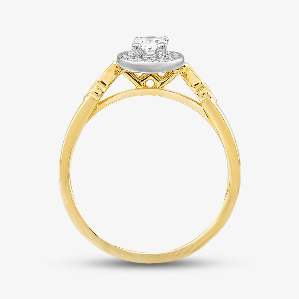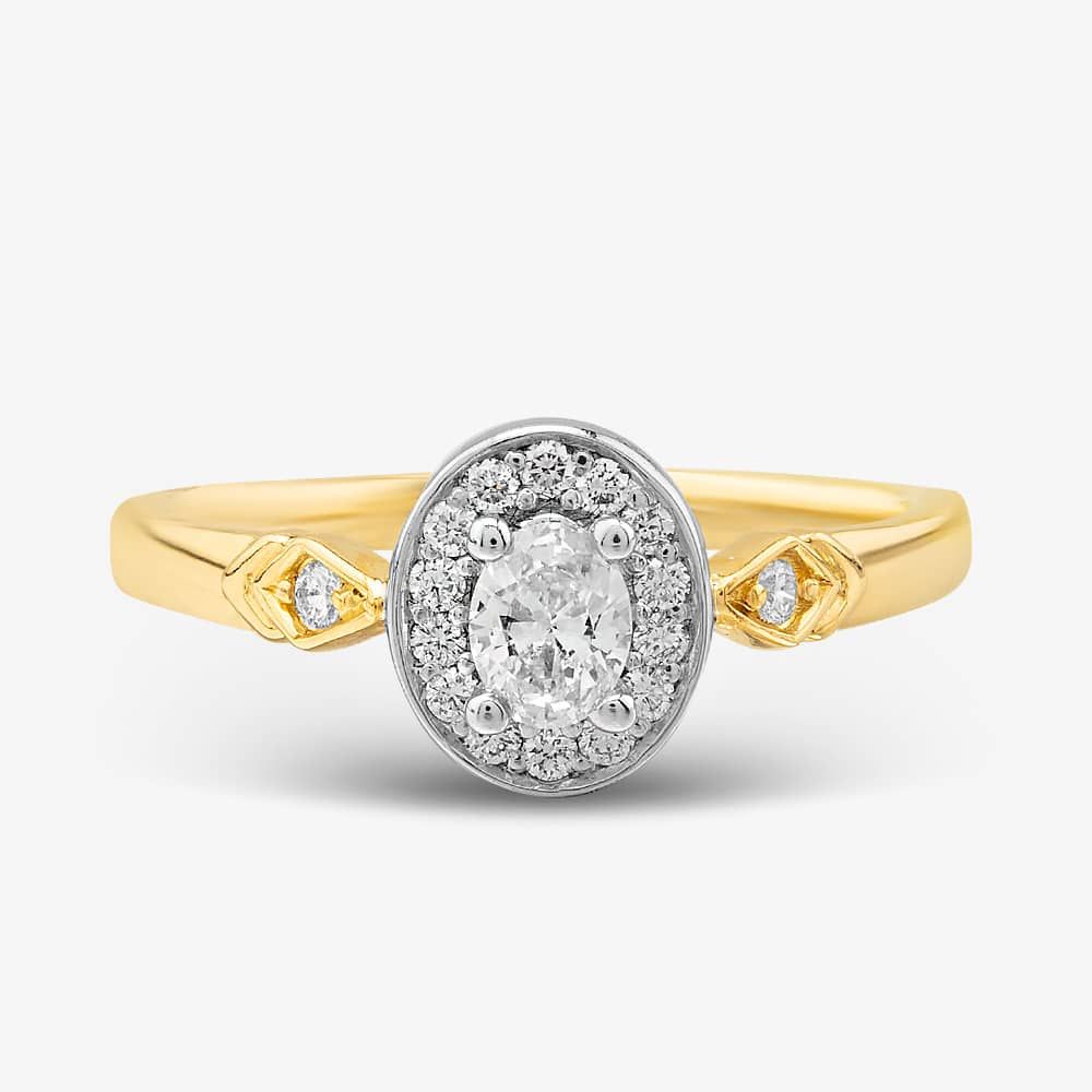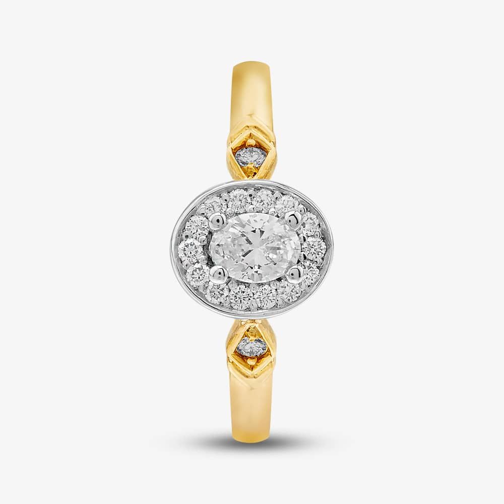 This beautiful halo ring is delicately crafted from 9ct two-colour gold and set with an oval cut white diamond, surrounded by a halo of brilliant-cut white diamonds set in a four-claw central setting, accentuated further with brilliant-cut diamond shoulders. The total carat weight is 0.33ct.