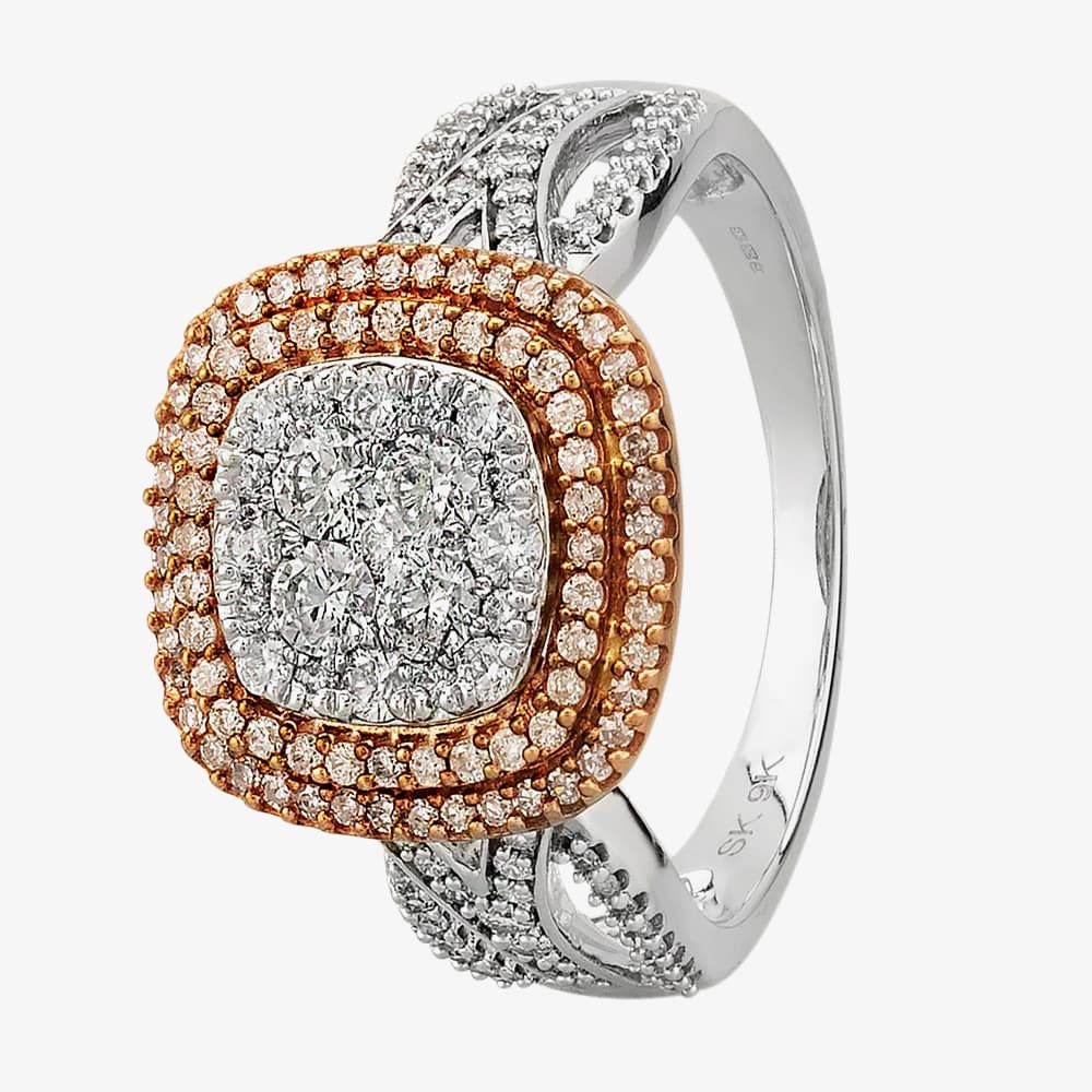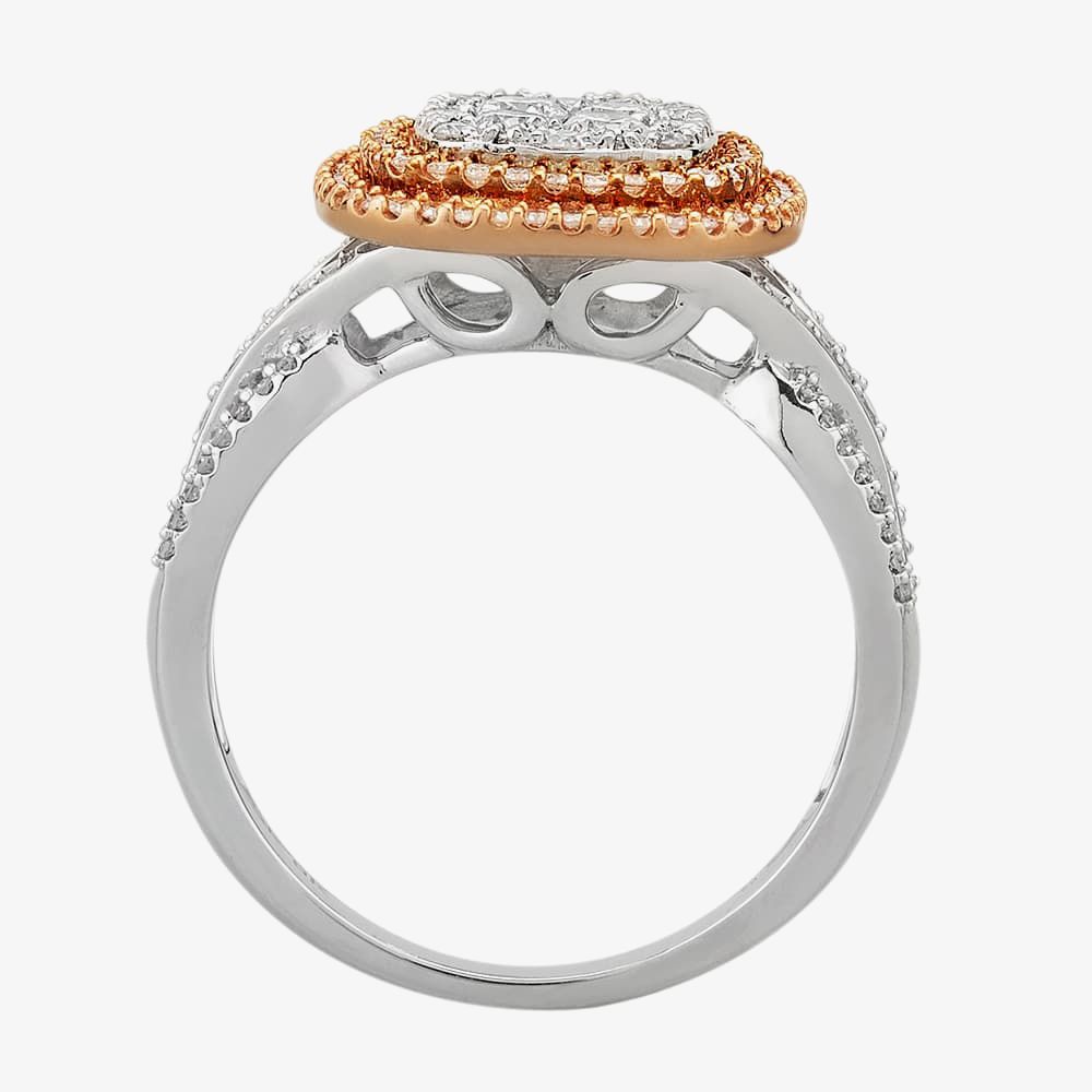 This unusual cluster ring is crafted around a cushion-shaped central mount which holds small, medium and larger diamonds in a kaleidoscopic Pavé pattern. Twin halos of stones set in rose gold cascade down to add height to the head, before joining to the body of the ring via the central v-split shoulders. Additional stone-set flanking shoulders give further support and stability to the cluster mount.