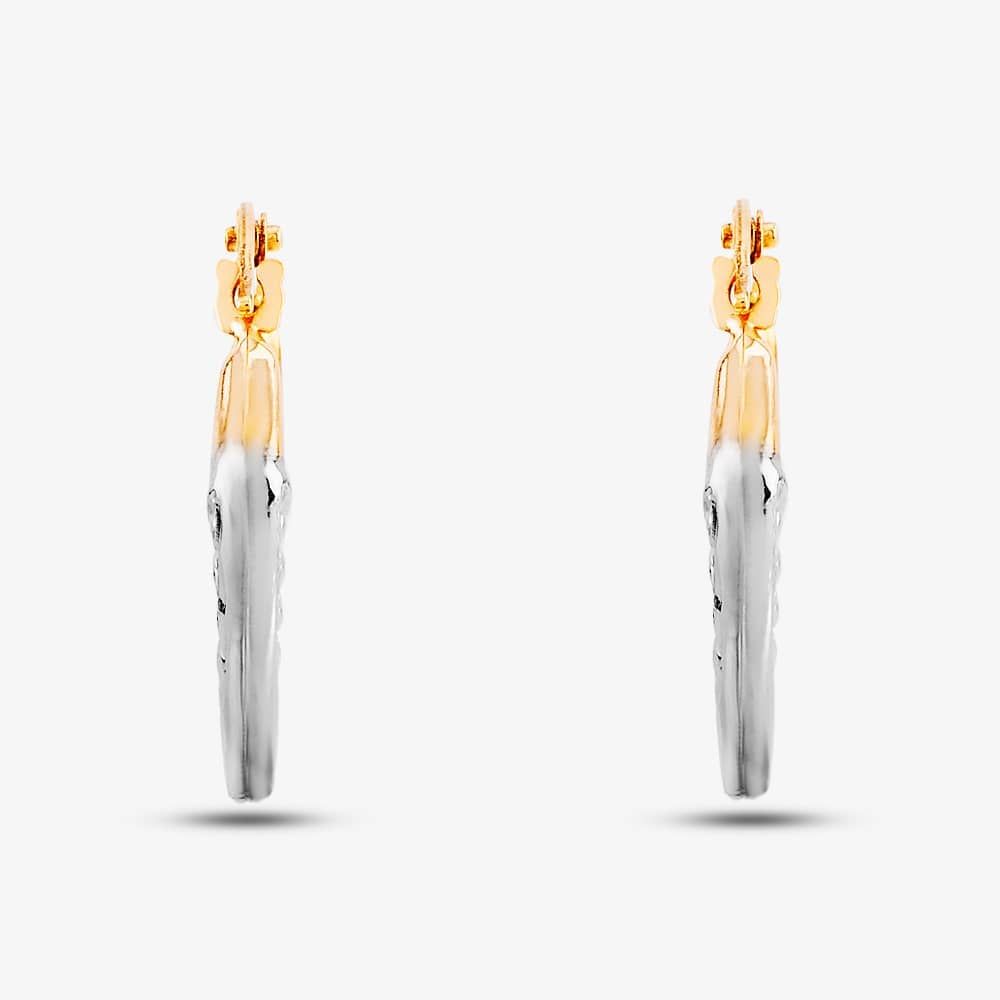 These heart shaped hoop earrings are created in 9ct Yellow Gold and 9ct White Gold with pattern detailing. They are completed with hinged snap fastenings.