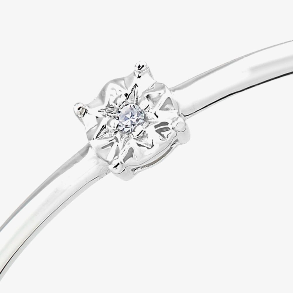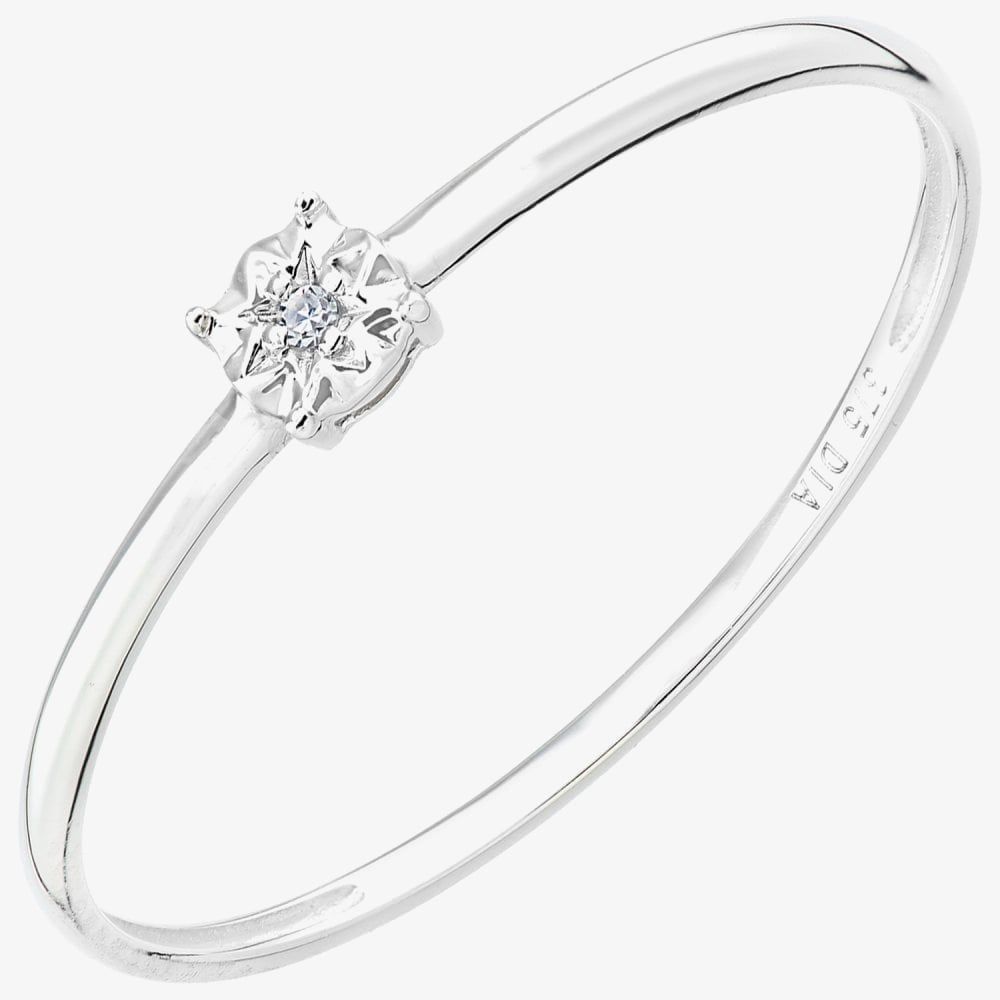 This delicate solitaire ring is crafted in 9ct white gold & features a four-claw illusion set sparkling diamond which has a total carat weight of 0.01ct. This ring is a perfect stand-alone piece or ideal for layering & combining with other rings to create your own unique look.