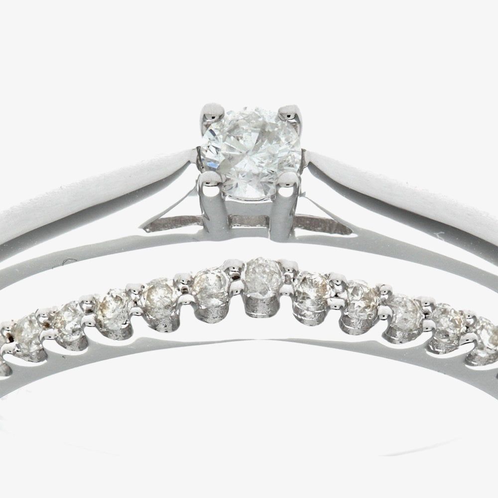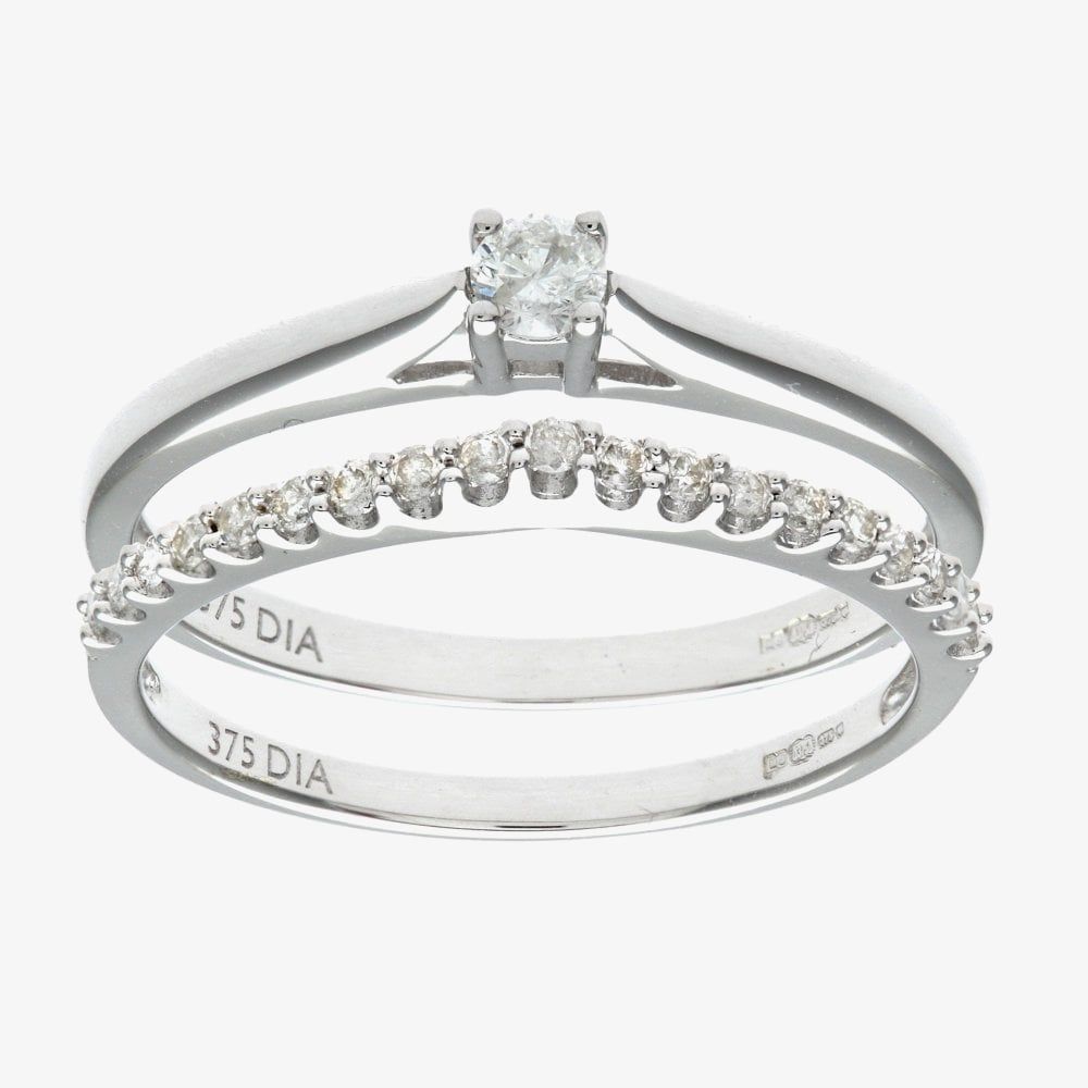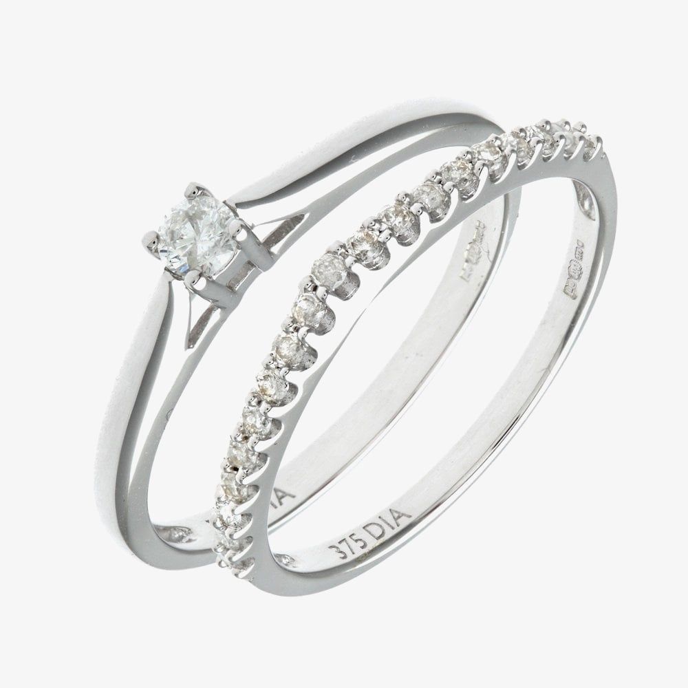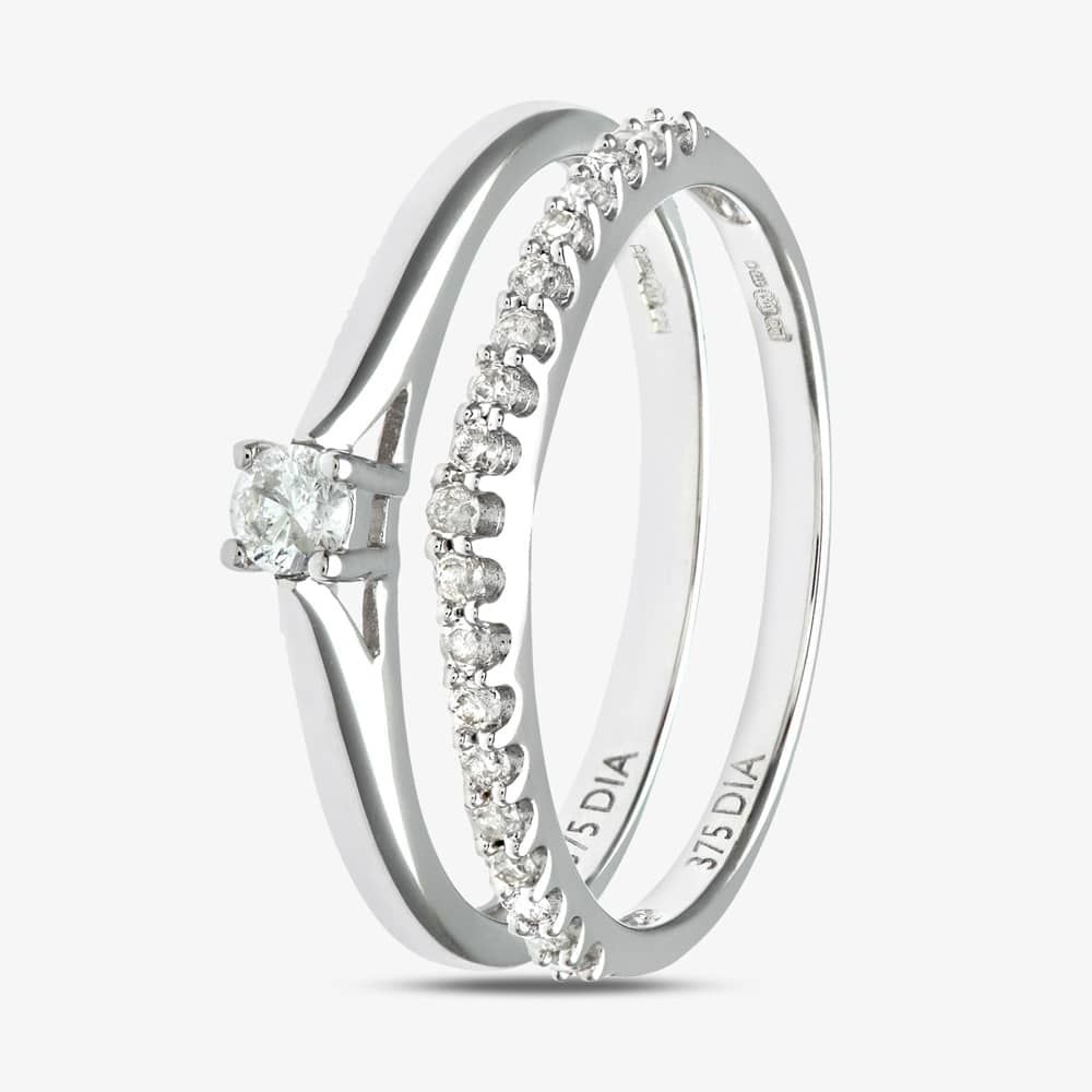 This attractive bridal ring set is crafted in 9ct white gold & features brilliant cut four claw diamond solitaire ring & a matching claw set diamond set band ring which have a total carat weight of 0.25ct.