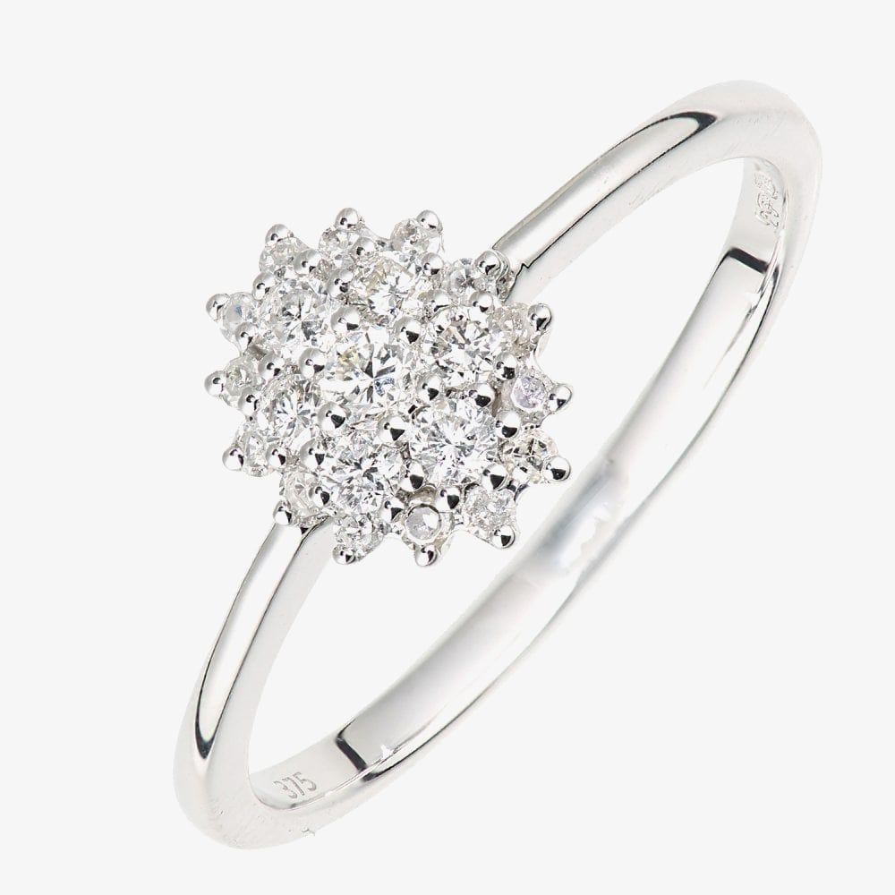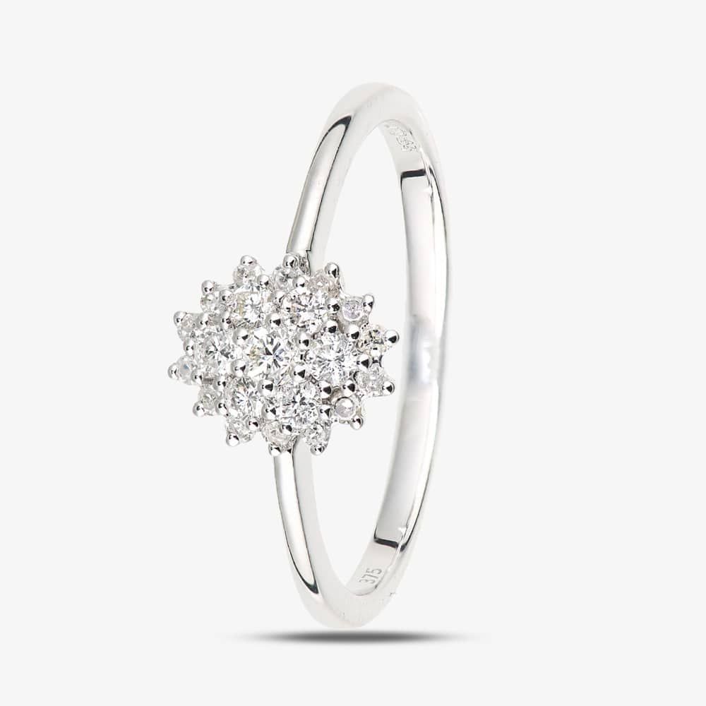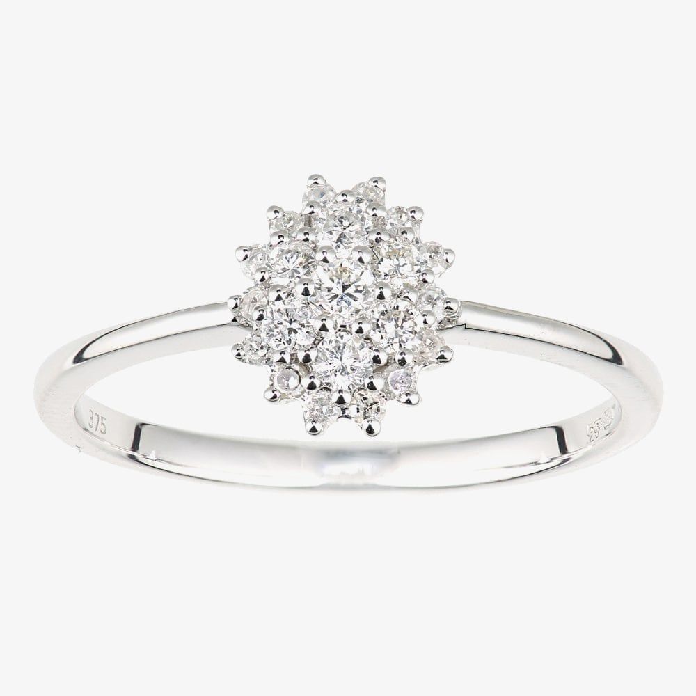 This elegant cluster ring is crafted in 9ct white gold & features an oval shape design set with claw set sparkling diamonds which has a total carat weight of 0.25ct. This ring is a perfect stand-alone piece or ideal for layering & combining with other rings to create your own unique look.