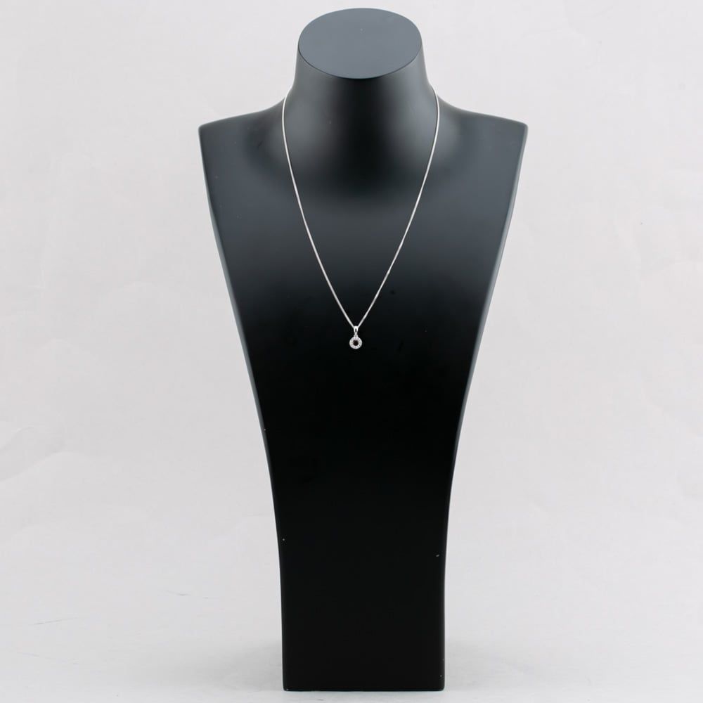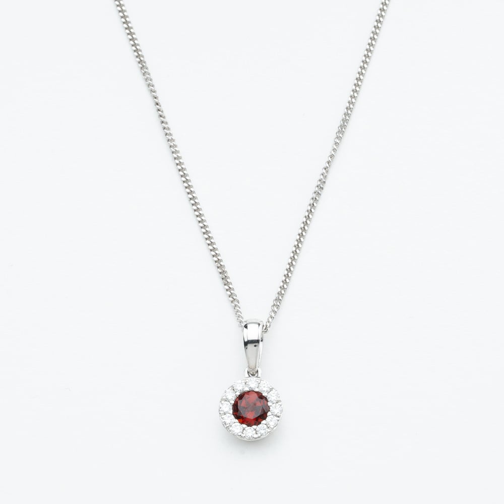 This elegant 9ct white gold pendant necklace features a vibrant 0.25ct garnet surrounded by a sparkling halo of 0.13ct diamonds. The rich red garnet beautifully contrasts with the shimmering diamonds and sleek white gold, creating a timeless and sophisticated piece perfect for any occasion.