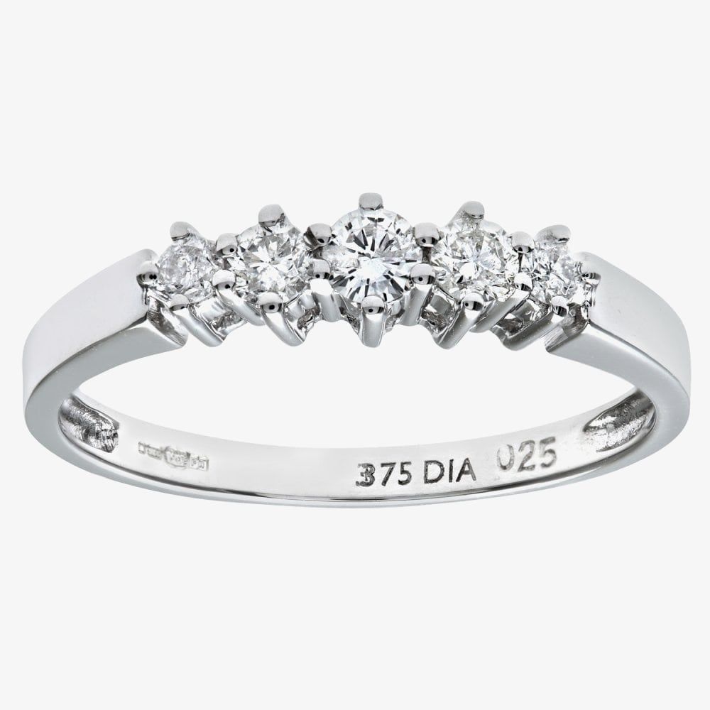 This attractive five stone ring is crafted in 9ct white gold & features brilliant cut claw set graduating diamonds which have a total carat weight of 0.25ct. This ring is a perfect stand-alone piece or ideal for layering & combining with other rings to create your own unique look.
