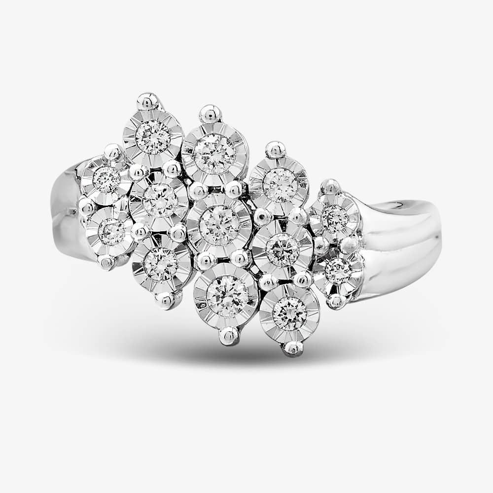 This abstract wave cluster ring is delicately crafted from 18ct white gold. The stylish design features a wave cluster of 0.25ct white brilliant-cut diamonds set in a four-claw central setting.