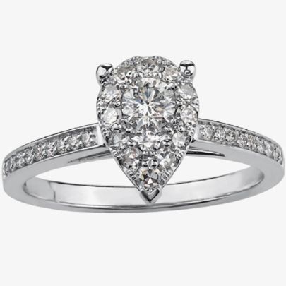 Crafted to resemble a pear-cut diamond with a twelve stone halo, this pretty pear-shaped cluster ring is illusion-set with a 0.12ct round brilliant diamond and a 0.01ct diamond 'point', before the mount is fixed to a half-eternity set band of eighteen diamonds.