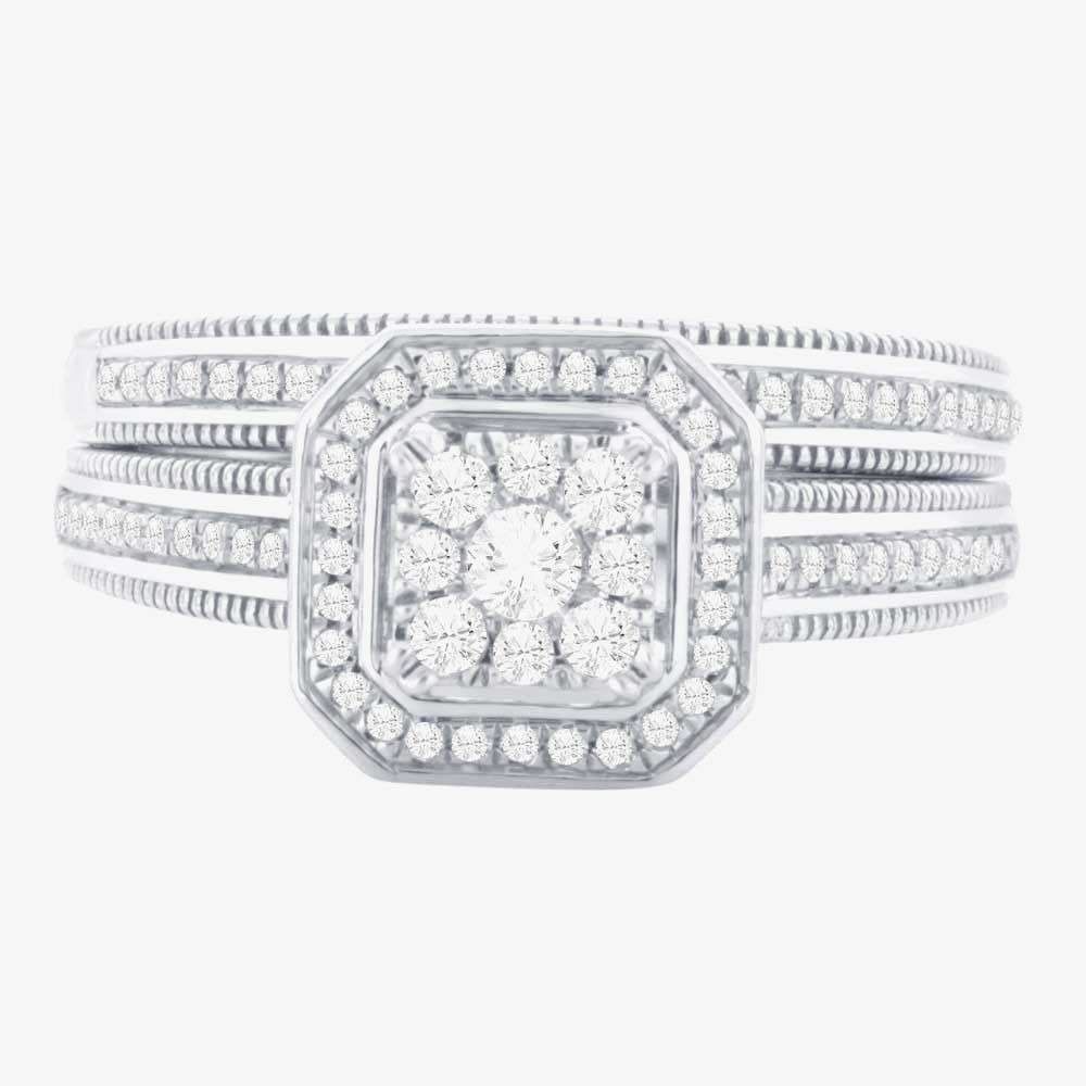 This stunning bridal set crafted from 9ct white gold features a diamond square cluster with floating halo, mill grain edging and stone set shoulders which match the half eternity ring.