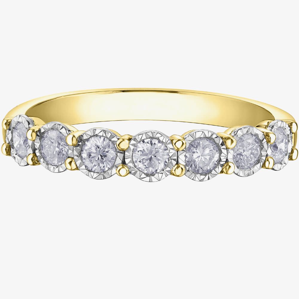 This beautiful two colour gold half eternity ring features a 9ct Yellow Gold band with 0.35ct of diamonds set in 9ct White Gold.