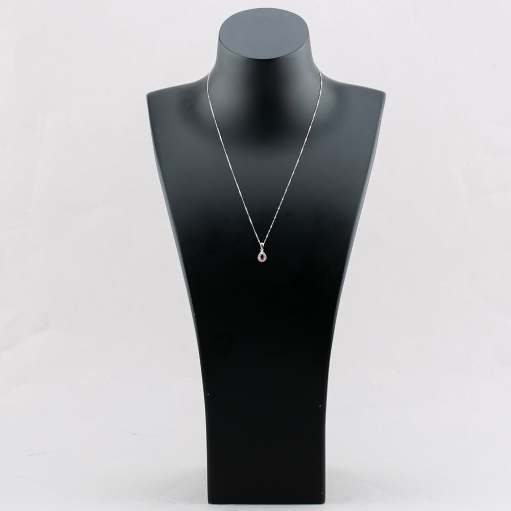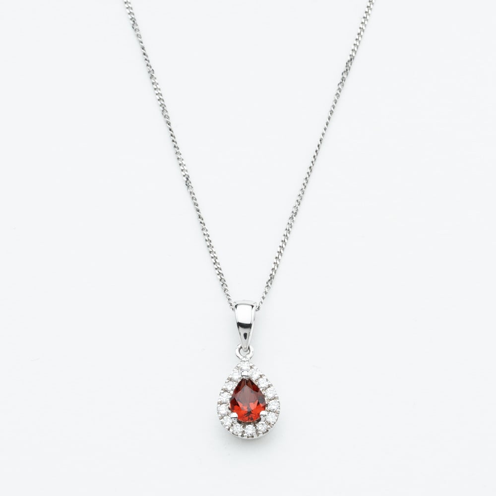 This elegant 9ct white gold pendant necklace features a 0.40ct pear-cut garnet, surrounded by a sparkling halo of diamonds. The deep red garnet contrasts beautifully with the brilliant diamonds and sleek white gold setting, creating a timeless and sophisticated piece that exudes elegance.