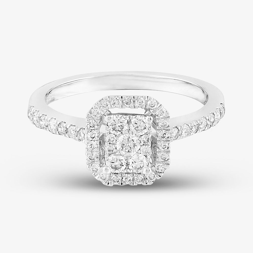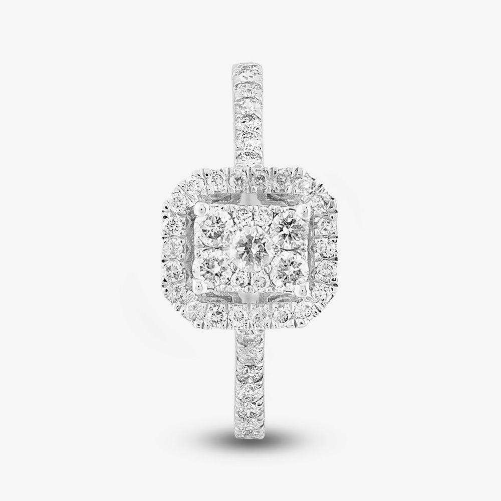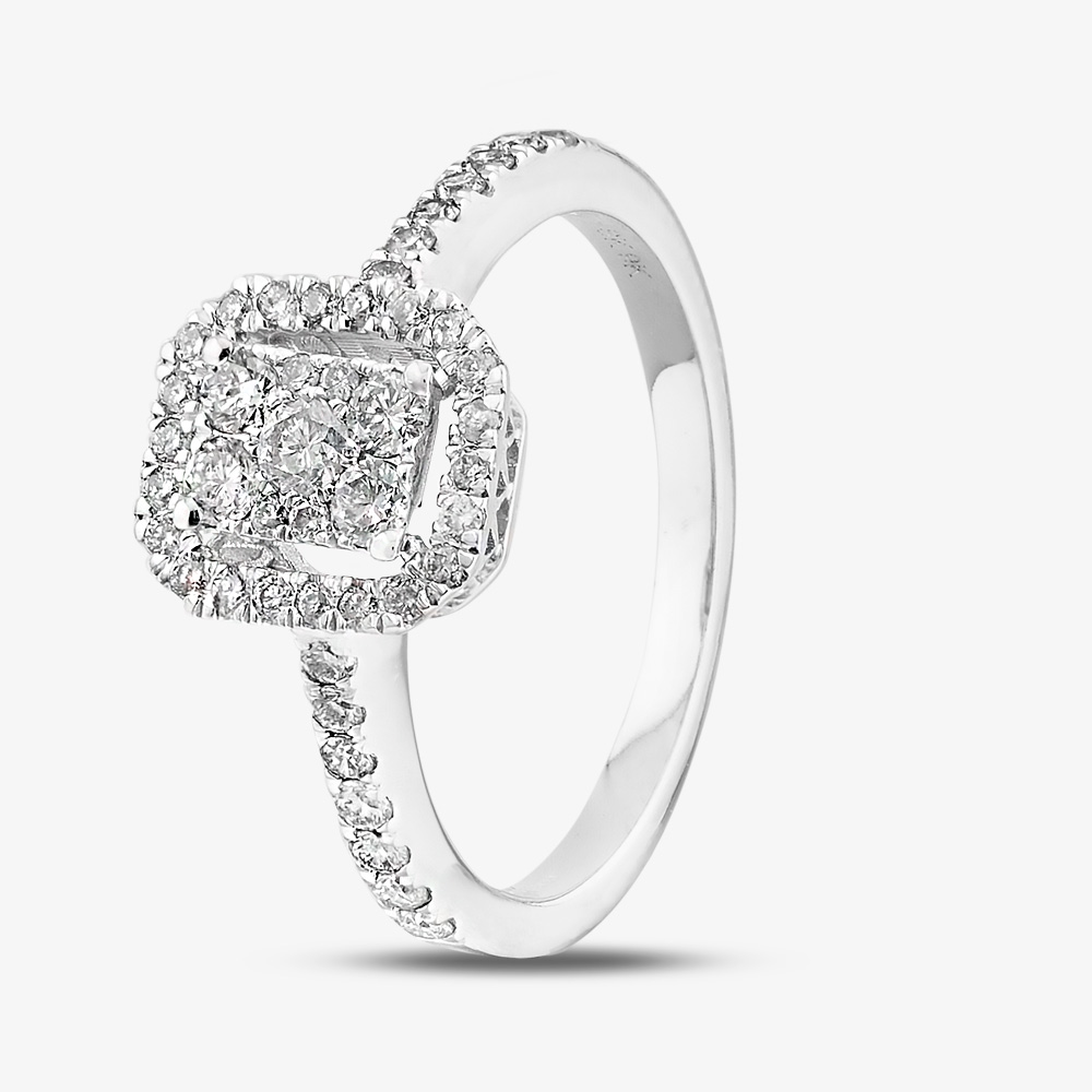 At its center, a captivating oblong cluster of round-cut diamonds takes the spotlight, framed by a halo of smaller briliant-cut diamonds that enhance its brilliance. Crafted in lustrous 9ct white gold, the band adds a touch of modern luxury to this timeless design.
