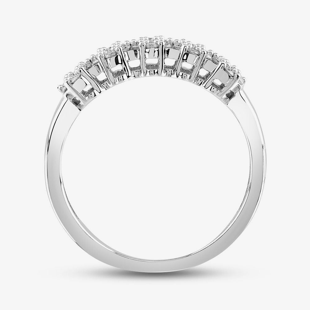A wonderful ring that has been created in 9ct white gold and features five flower cluster designs set with glistening round cut claw set diamonds which shimmer and catch the light beautifully. With a total diamond carat weight of 0.50ct this ring would make the perfect dress ring or an alternative wedding band or half eternity ring.
