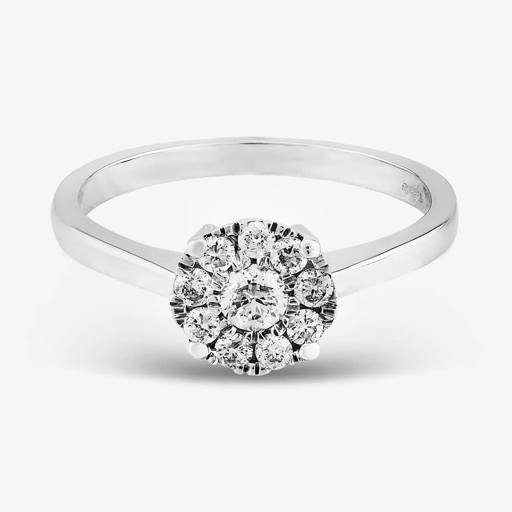 Captivating 9ct White Gold 0.50ct Diamond Cluster Ring—an exquisite blend of sophistication and brilliance. This ring features a dazzling 0.50 carat cluster of round-cut diamonds, meticulously set in lustrous 9ct white gold.