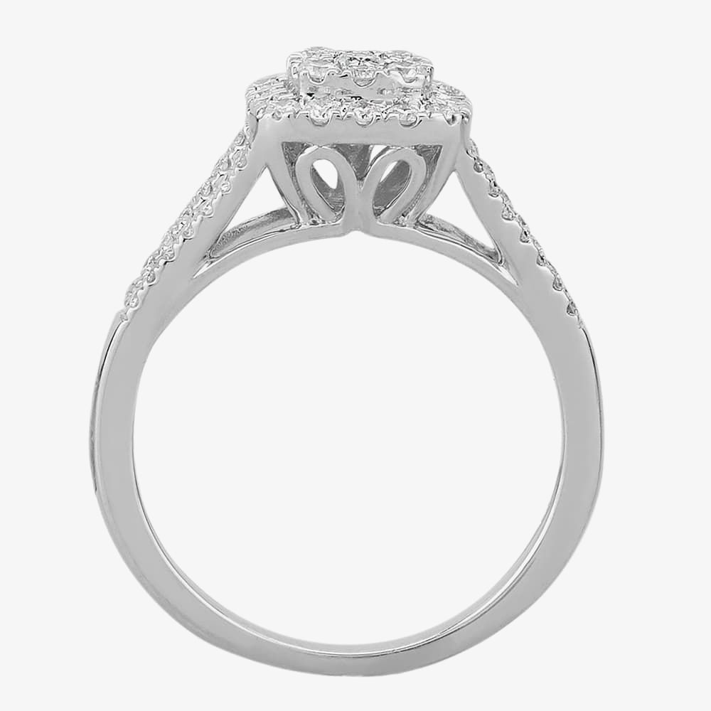 At its heart lies a captivating cushion shaped diamonds, surrounded by a halo of smaller diamonds that amplify its brilliance. The split-shouldered band, crafted in 9ct white gold, adds a contemporary twist to this classic design, making it perfect for the modern woman with discerning taste.