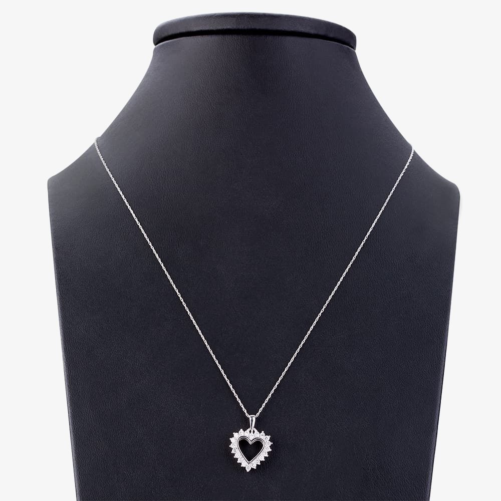 This beautifully delicate open heart pendant is the perfect addition to your collection This stunning pendant in 9ct white gold features eye-catching claw set diamonds around the edge. The pendant comes with a 9ct white gold 18-inch chain. Perfect for a special occasion or as a gift for your loved one.