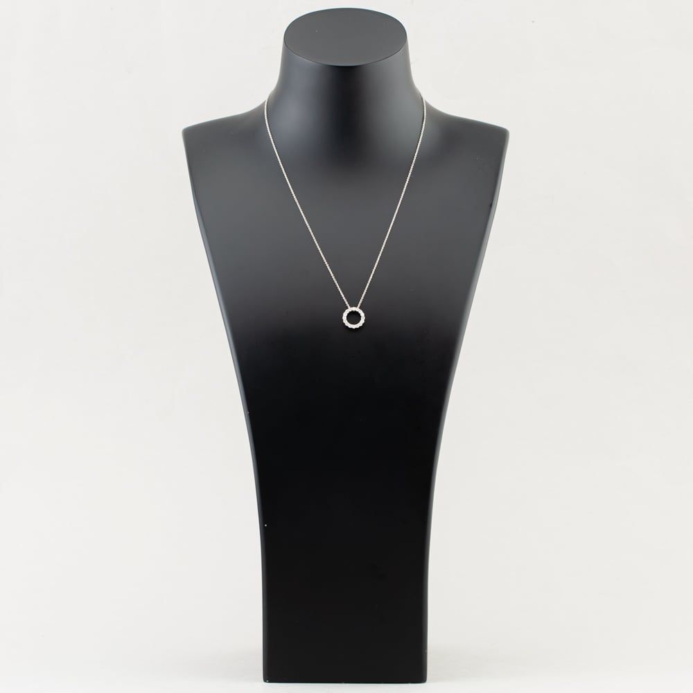 This stunning 9ct white gold necklace features an elegant open circle design, symbolising unity and eternity. The pendant is adorned with 16 dazzling diamonds, totalling 0.55ct, adding brilliance and sophistication to the piece. Suspended on a fine trace chain, this necklace offers a timeless and versatile style, perfect for elevating any outfit with a touch of sparkle.