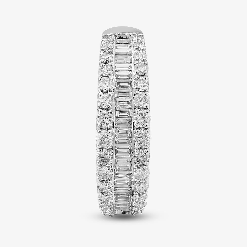 Crafted in 9ct White Gold, this stunning ring features two rows of sparkling brilliant cut diamonds framing a central row of elegant baguette cut diamonds. A sophisticated design that beautifully blends classic and contemporary styles.
