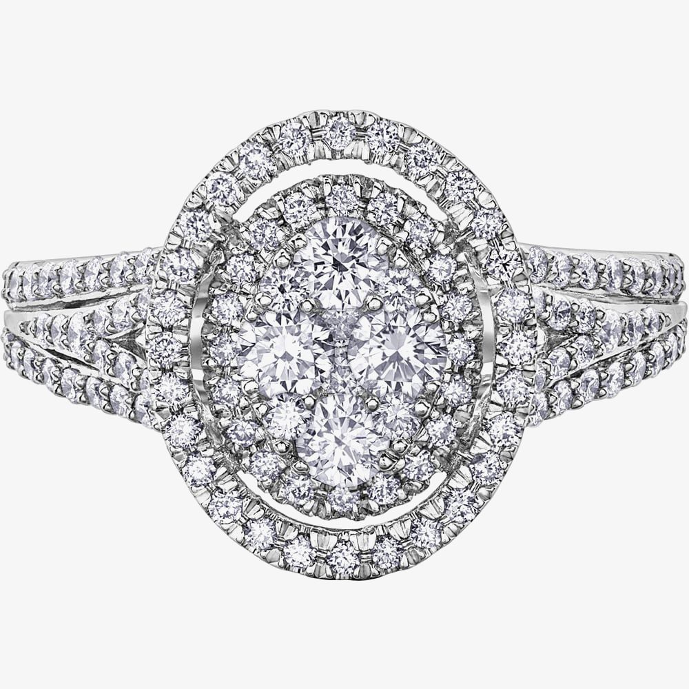 Created in 9ct White Gold, this beautiful ring features a cluster of diamonds, surrounded by halos of diamonds. There are further diamonds set within the split shoulders, with a total of 116 diamonds and a total weight of 1ct.