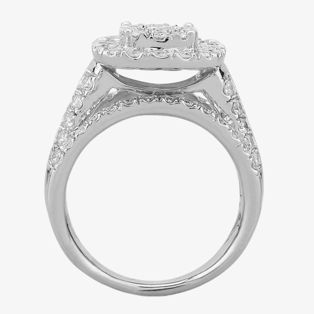This flamboyant cluster ring combines multiple stone-set raised split shoulders with a fishtail shank, cushion-shaped cluster mount and a square halo of diamonds.