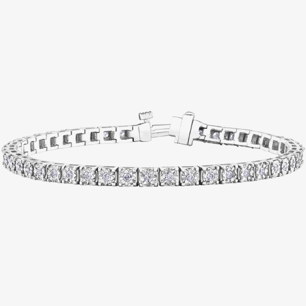 This stunning 9ct White Gold bracelet is adorned with 54 round cut diamonds with a total weight of 2.00ct. It is 7.5 inches in length and fastens with a snap clasp.