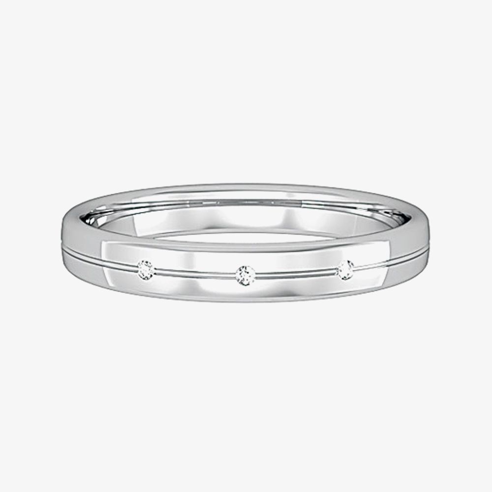 Our range of gold rings encompasses all the needs of the modern market place that is style sophistication and most of all quality at a very reasonable price. Bearing a subtle width of 3mm, this white gold wedding band has been masterfully set with 3 sparkling diamonds, perfect for accompanying your treasured engagement ring.
