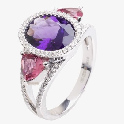 A great combination of stones are bestowed in this ring. The purple from the amethyst and pink from the tourmaline fuse all their mystique to create this truly unique look. With the additional of the sparkly from the diamonds mean this ring is full of energy, colour and elegance. Make this your new addition to your jewellery family.