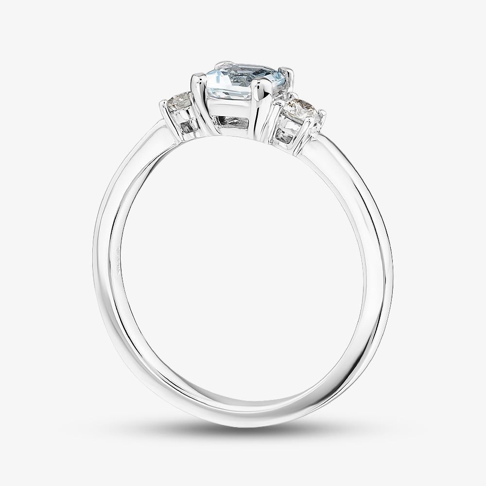Striking and elegant, the 9ct White Gold Aquamarine & Diamond Three Stone Ring features a stunning aquamarine at it's heart in a classic four claw setting, flanked by two sparkling, round cut white diamonds. Finished with a polished band crafted from 9ct white gold, this refined design represents the past, present and future making it a sentimental choice for special occasions.