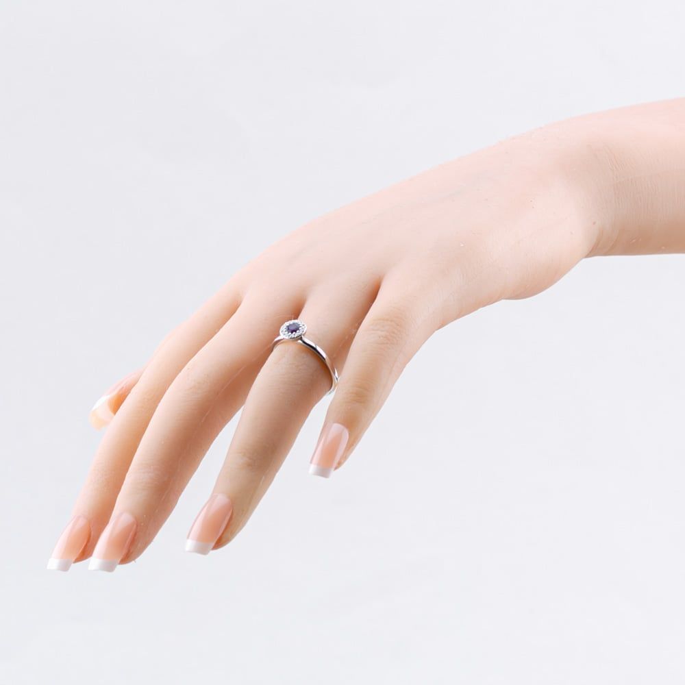 This elegant 9ct white gold ring features a brilliant-cut amethyst weighing 0.28ct, surrounded by a sparkling cluster of 0.10ct diamonds. The rich purple hue of the amethyst contrasts beautifully with the shimmering diamonds and sleek white gold setting, creating a timeless and sophisticated piece full of charm.