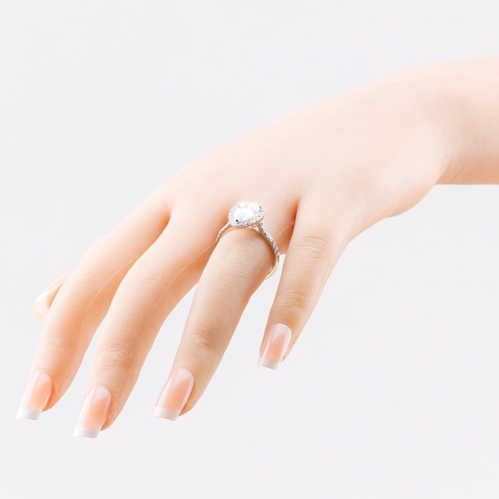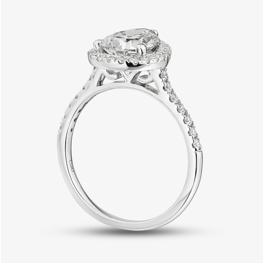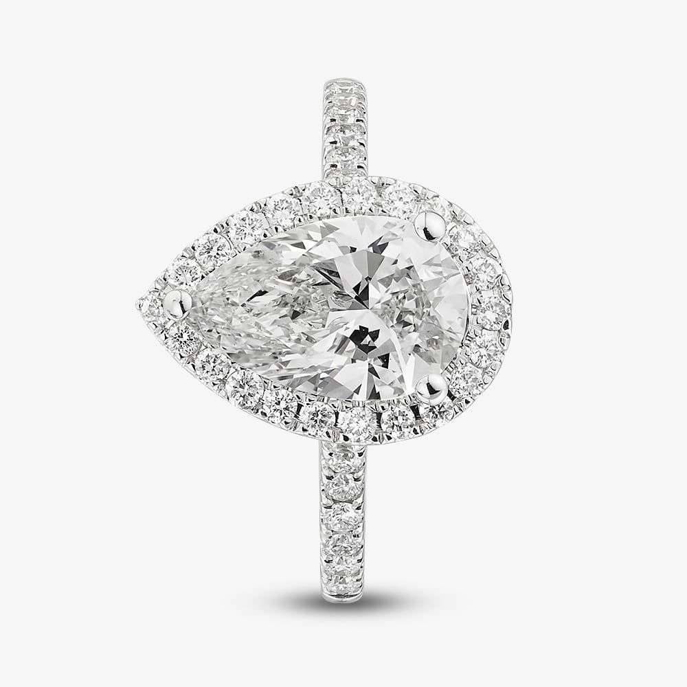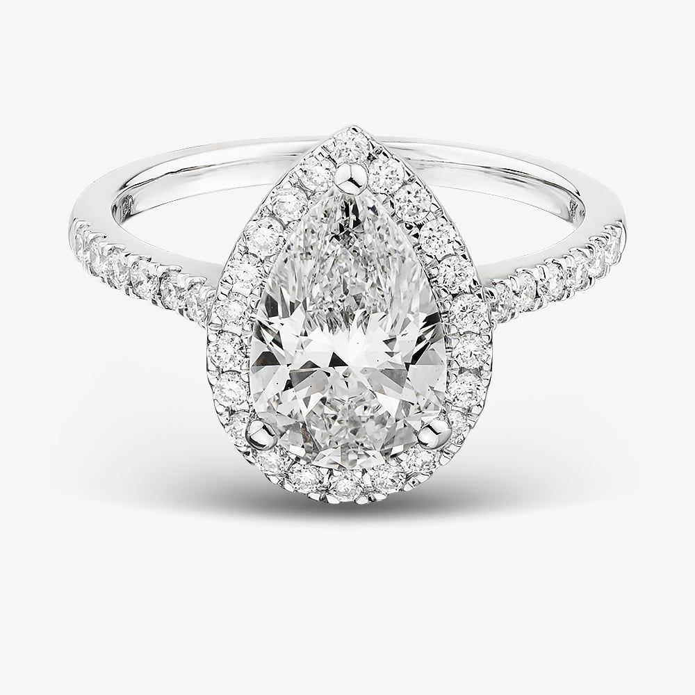 Exude refined elegance with this 9ct White Gold Ring, featuring a stunning pear-cut lab-grown white diamond centre stone surrounded by a halo of brilliant-cut lab-grown diamonds and diamond-set shoulders. With a total carat weight of 2.40ct, this exquisite piece radiates timeless sophistication and luxury, perfect for celebrating life’s most memorable moments.