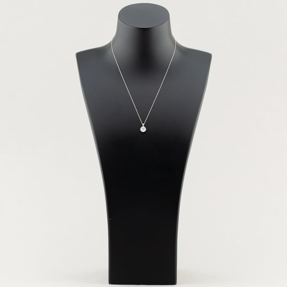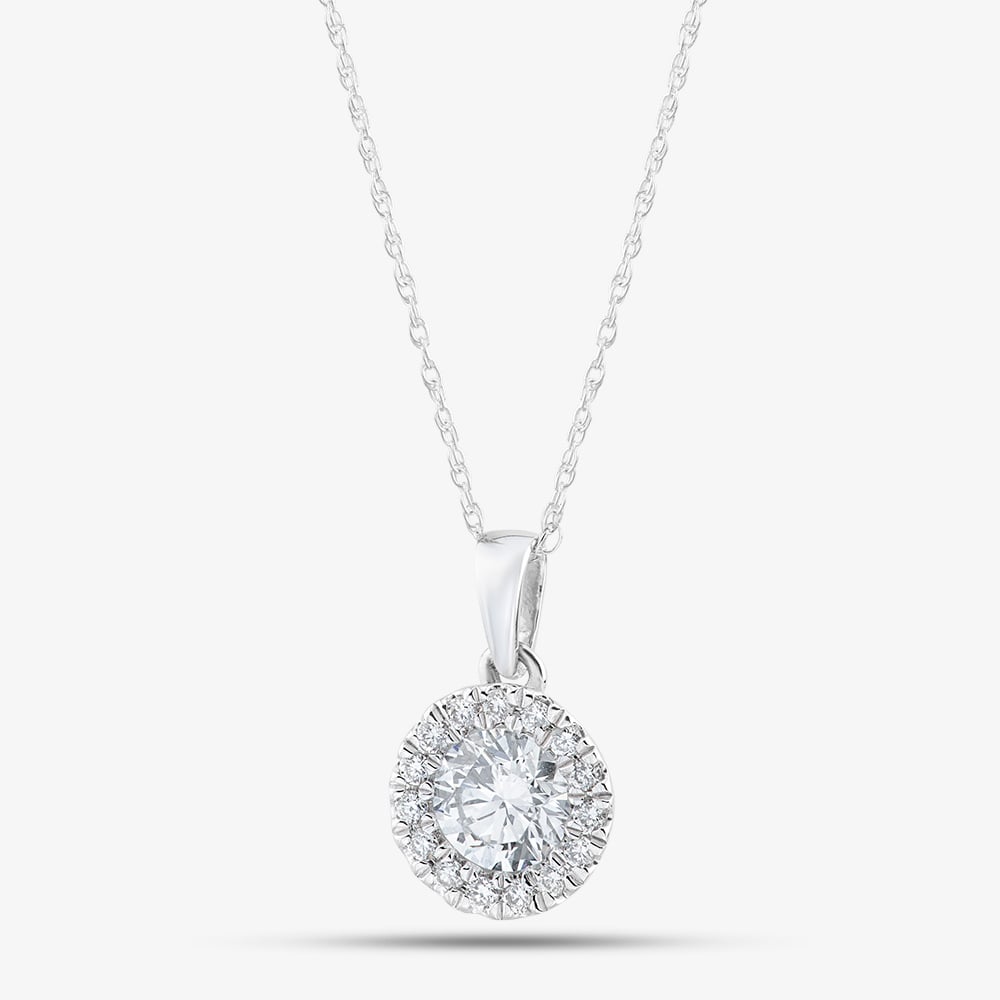 This elegant necklace features a brilliant-cut diamond at its centre, surrounded by a halo of smaller diamonds, totalling 0.60ct. With a D-E colour grade and VVS-VS clarity, the diamonds offer exceptional brilliance and clarity. Set in 9ct white gold, the pendant hangs gracefully from a delicate prince of wales chain, creating a timeless and sophisticated piece perfect for any special occasion.