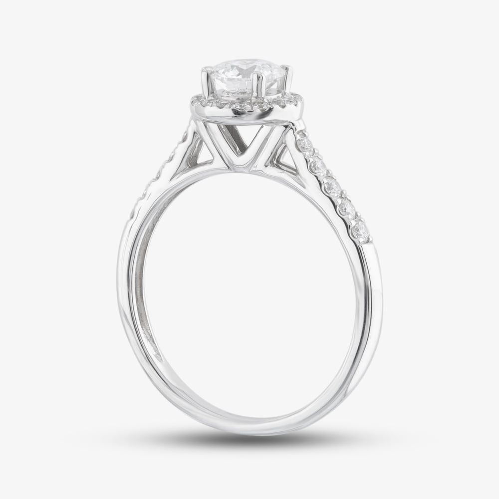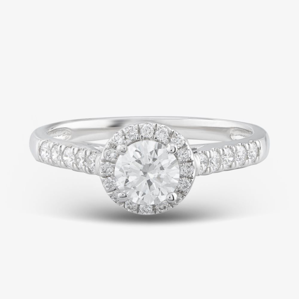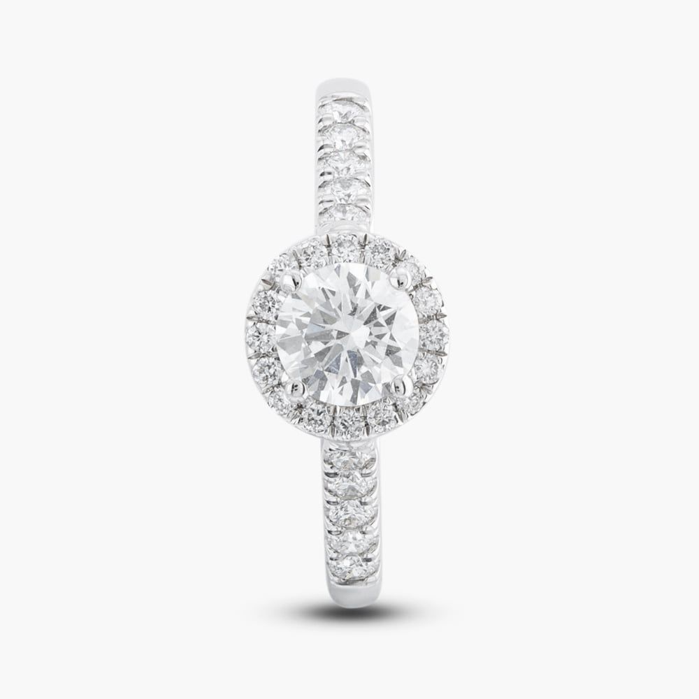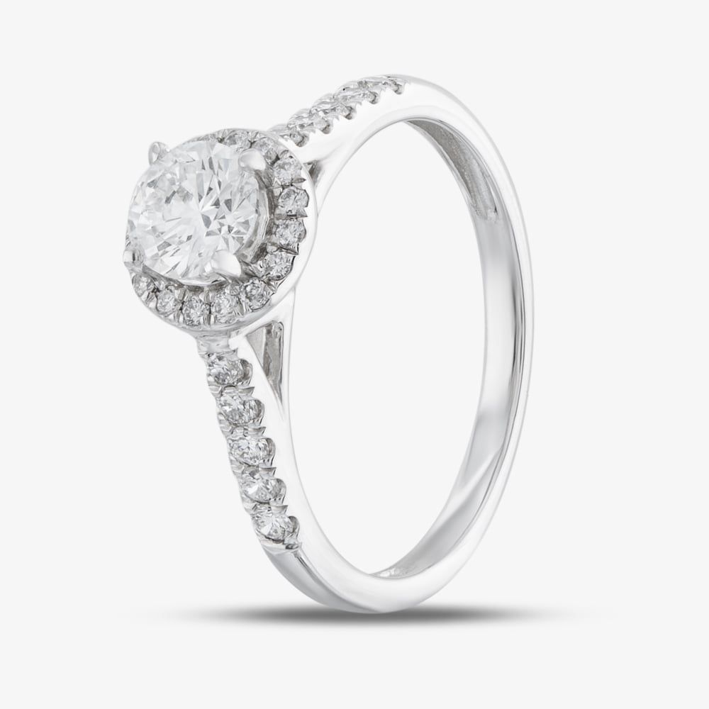 This elegant ring showcases a total diamond weight of 0.75ct, featuring a brilliant-cut lab-grown diamond at its centre, enhanced by diamond-accented shoulders. Crafted in sleek 9ct white gold, it offers a timeless and sustainable choice for any special occasion.