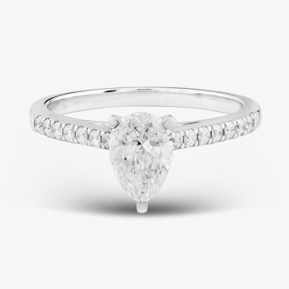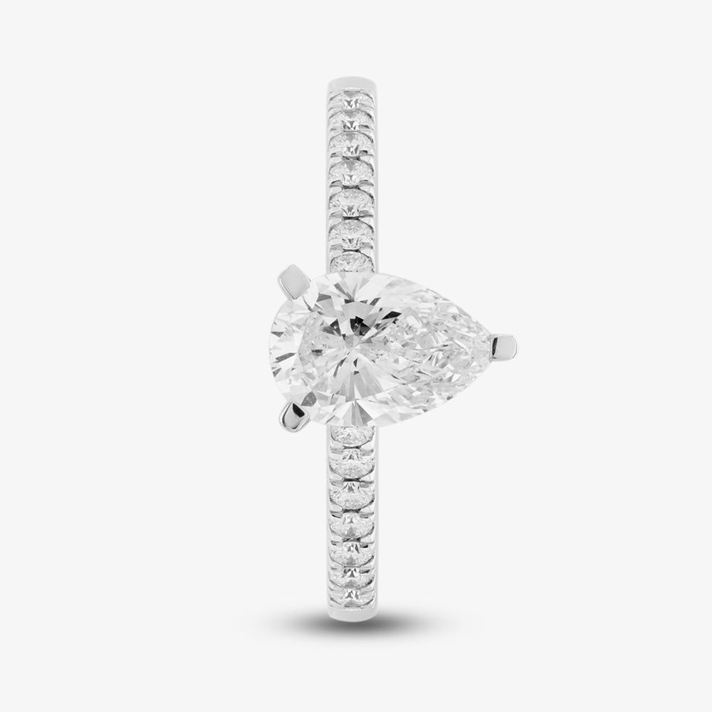 This exquisite ring features a certified lab-grown 1.20ct pear-cut diamond as its centrepiece, gracefully complemented by brilliant-cut diamonds set along the shoulders. With an impressive VS2 clarity and a radiant F colour grade, the diamonds deliver exceptional brilliance and elegance. Crafted in sleek 9ct white gold, this stunning design combines timeless sophistication with sustainable luxury, making it an unforgettable choice for any special occasion.
