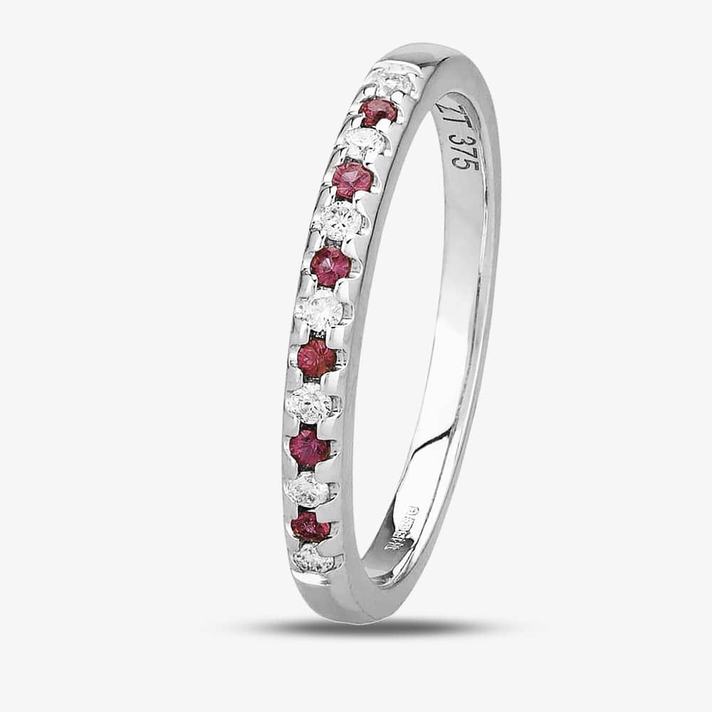 This beautiful half-eternity ring is delicately crafted from 9ct white gold. Adorning the ring is an alternating pattern of red brilliant cut rubies and white brilliant cut diamonds, each set in a four-claw setting.