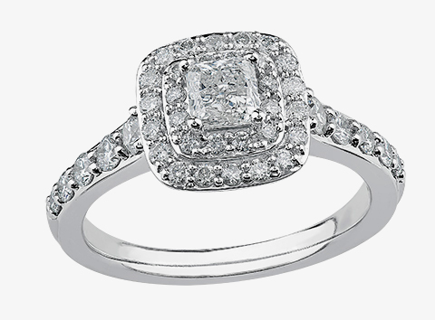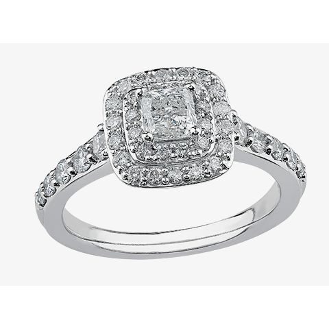 Surrounded by a double halo of round-cut diamonds, a 0.20ct princess-cut diamond takes centrestage in this beautifully designed cluster ring. The cool white hues of 9ct white gold accentuate the sparkle and brilliance of the forty-one diamonds, adding a modern twist to a classic, vintage-inspired piece.