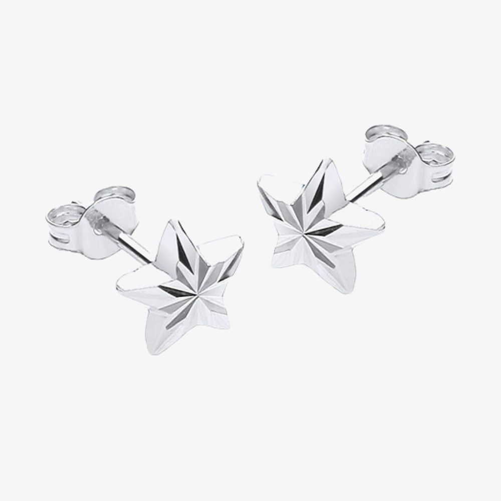 These adorable stud earrings are created from 9ct white gold & feature a 6 x 6 mm polished diamond cut star design & they are completed on a post & butterfly back fastening.